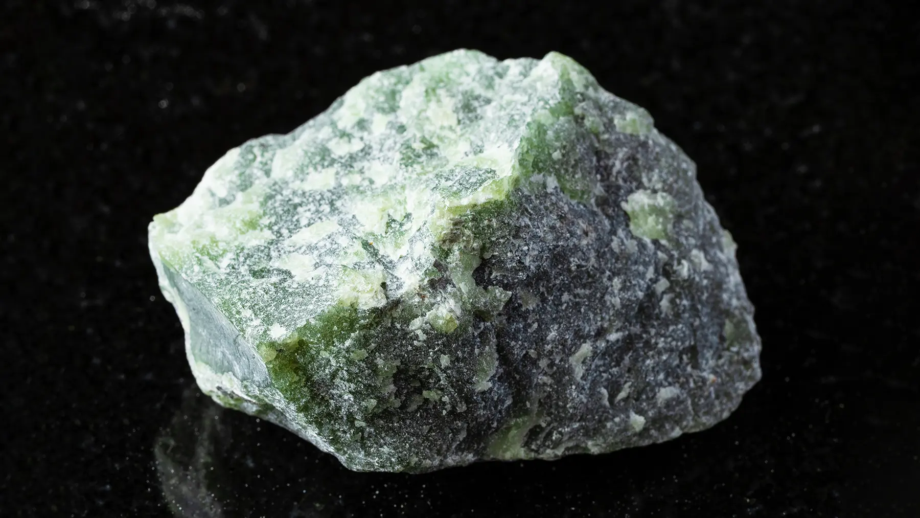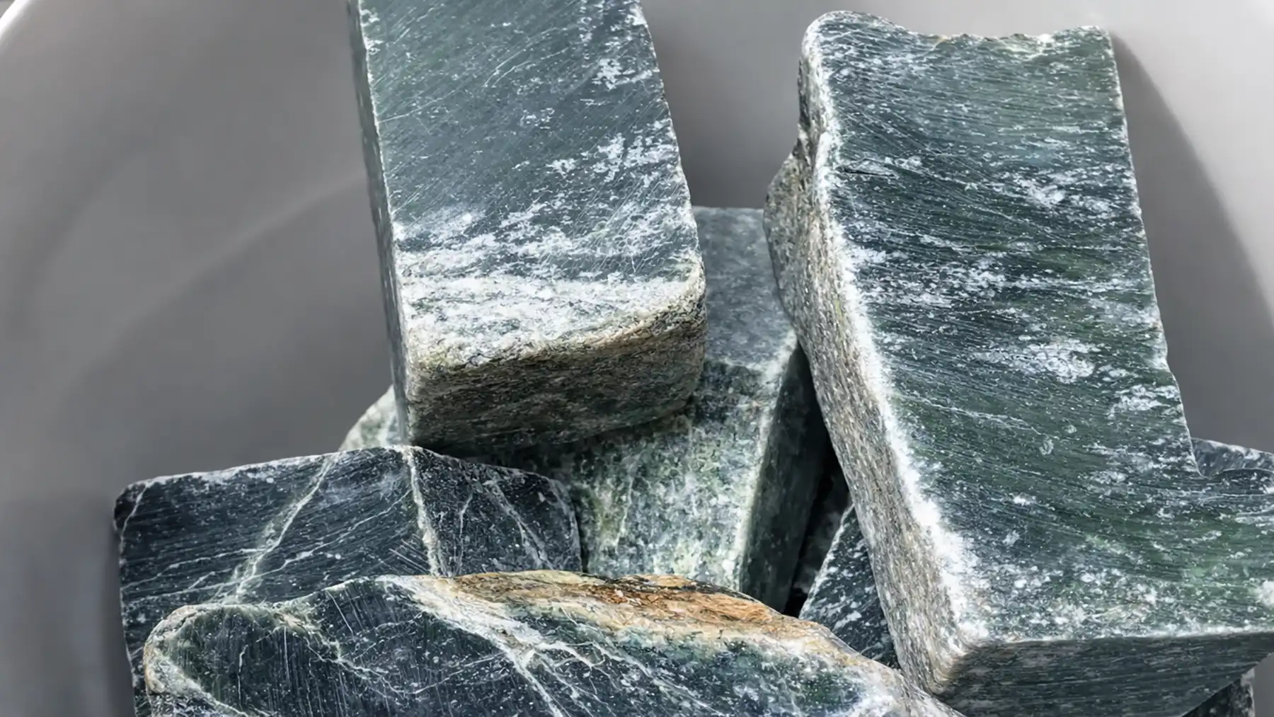 У нефрита зеленоватый оттенок: от светлого яблочного до глубокого темно-изумрудного. Порода бывает гладкой или колотой, матовой или с блеском. Это один из самых эстетически выразительных камней для бани, но дорогой.