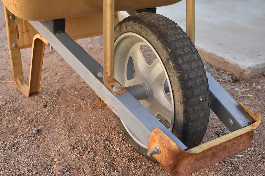 Если тачка двухколесная, упор должен находиться между колесами, под краем для выгрузки. Упор также позволяет хранить тачку вертикально — так она занимает меньше места.
