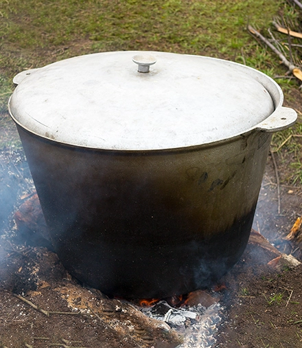 Решетки сделайте из нескольких веточек — установите их враспор между стенками ведра. Используйте лиственные деревья и кустарники (хвойные не берите — смола испортит вкус копчености), кору с веток обязательно снимите. Разложите на решетках продукты, накройте ведро его крышкой и установите импровизированную коптильню над костром.