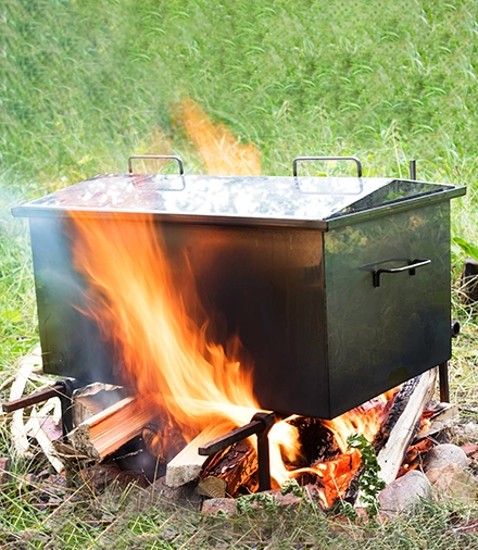 Копчение происходит в коптильне — металлической емкости с крышкой, которую ставят на огонь, газовую или электрическую плиту. Импровизированную коптильню можно сделать из подручных материалов, например из металлического бака или старой кухонной плиты.