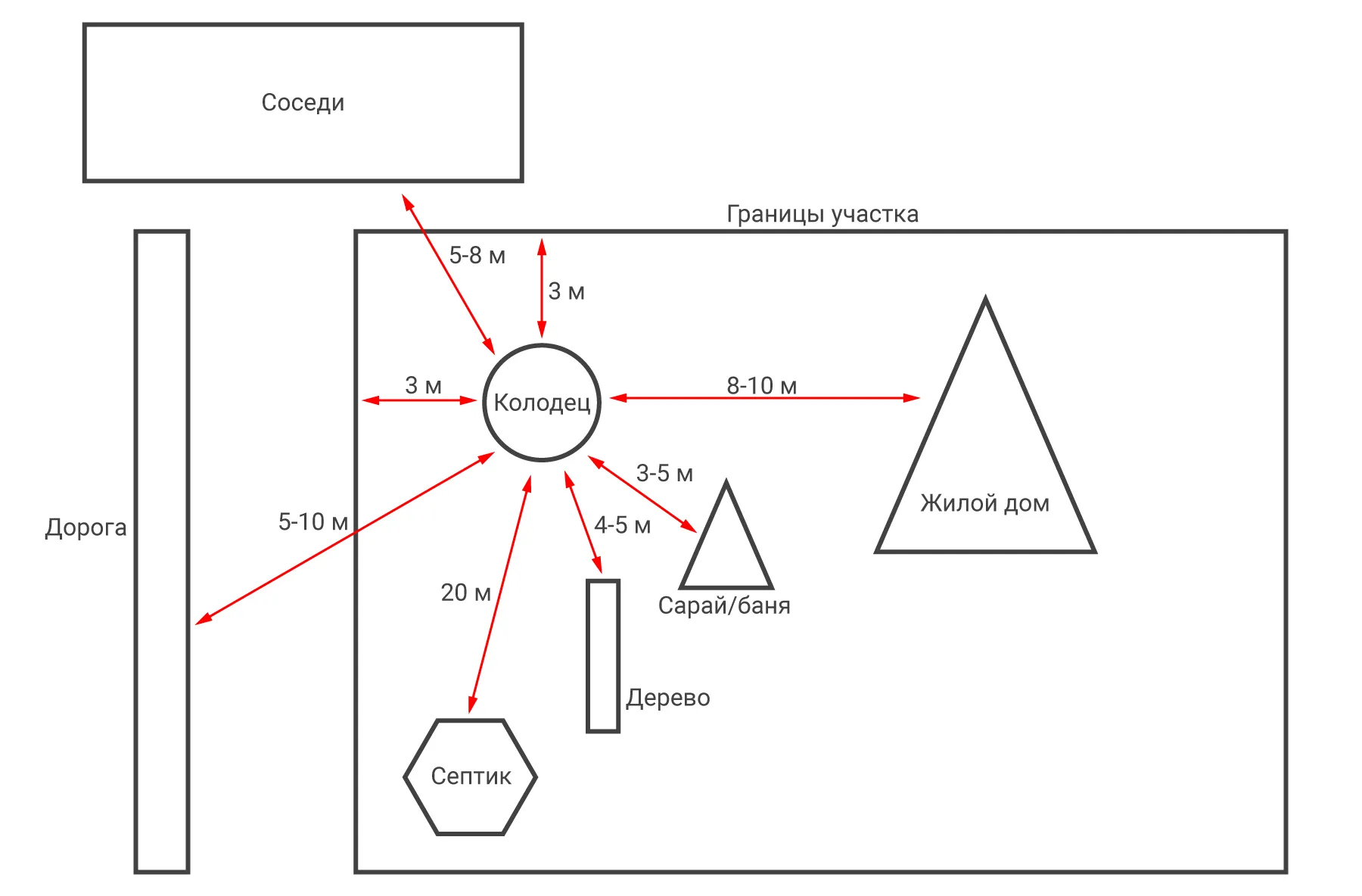 - Границы участка. Нельзя располагать колодец близко к ним, иначе возможны проблемы: споры с соседями из-за источника воды, нарушения санитарных норм (например, если сосед построит рядом септик), сложности с обслуживанием колодца, когда нужно подойти к нему с другой стороны.