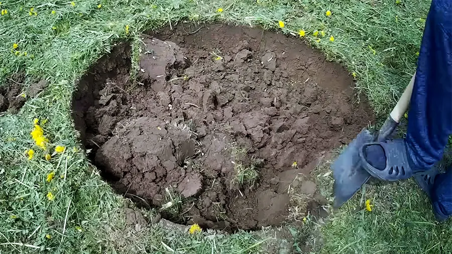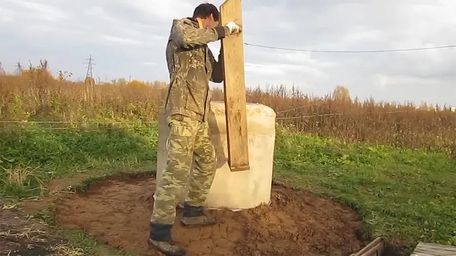 Выкопайте яму глубиной на 8–10 см меньше, чем высота первого кольца (если кольцо 1 м, копаем на 90–92 см). Проверяйте диаметр бруском — он должен быть одинаковым по всей глубине котлована.