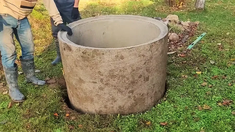 Когда первое кольцо просядет и сравняется с уровнем земли, поднимите следующее и аккуратно опустите сверху. Формируйте таким образом шахту из бетонных колец, углубляйте ее, пока на дне не появится вода.