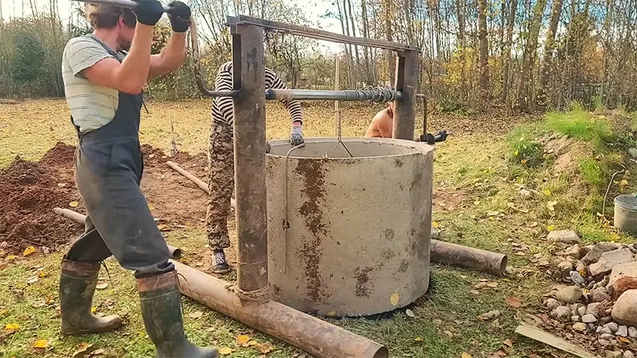 Установите подъемный механизм: треногу с лебедкой или самодельную конструкцию с воротом, как на фото. С его помощью опускайте кольца в шахту, а ведра с выкопанным грунтом поднимайте на поверхность.