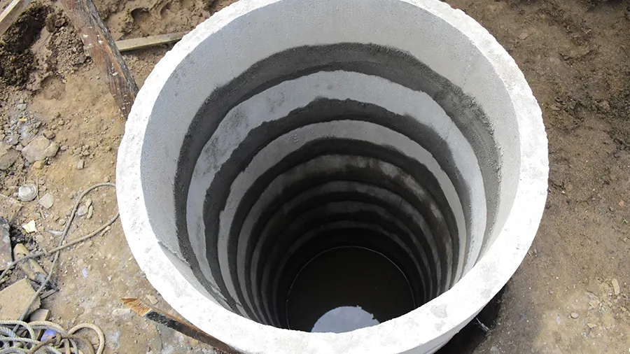 Самый распространенный и надежный вариант для дач и загородных участков. В качестве материала используют готовые железобетонные кольца, которые опускают в землю по мере углубления шахты. Стены получаются прочными и устойчивыми к смещению грунта. Герметичные и обработанные стыки защищают воду от загрязнений.