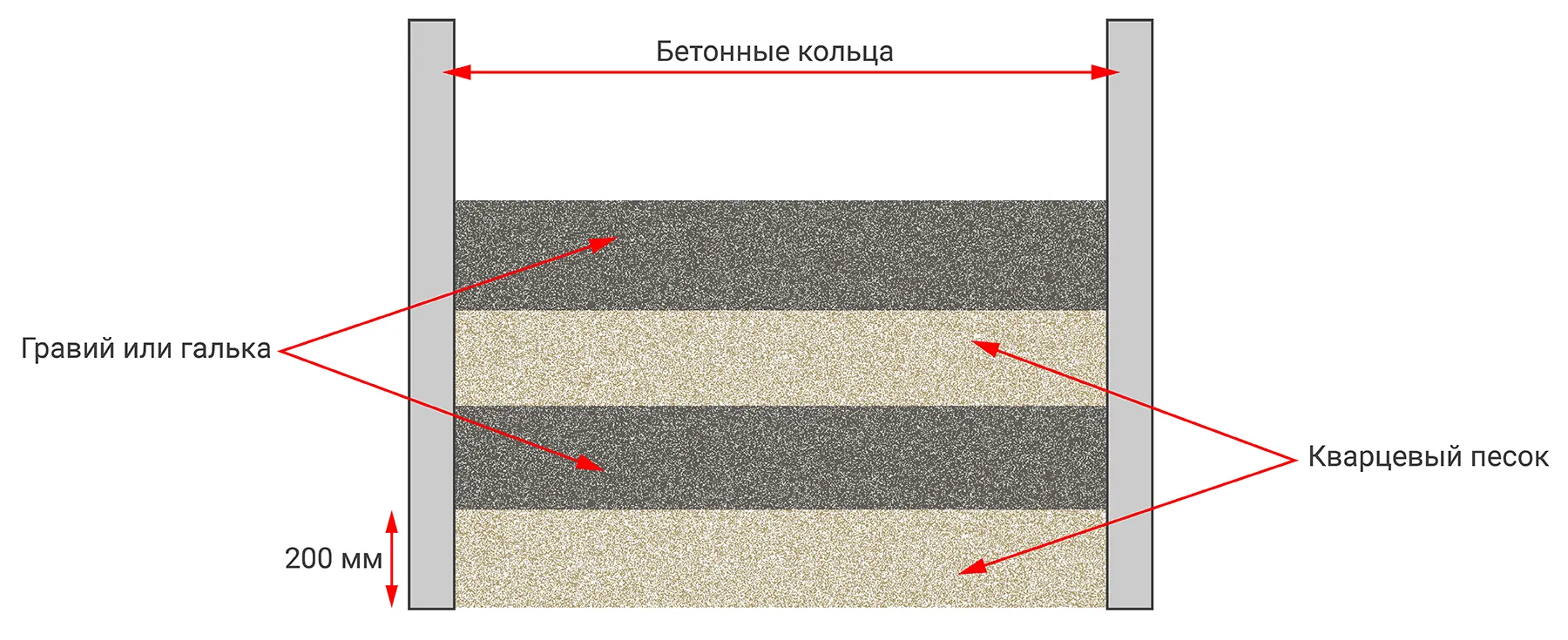 Это необходимый элемент для стабильной работы колодца. Его делают из природных материалов, которые не размывает вода. Самый популярный вариант — многослойная засыпка из кварцевого песка и гравия или гальки.