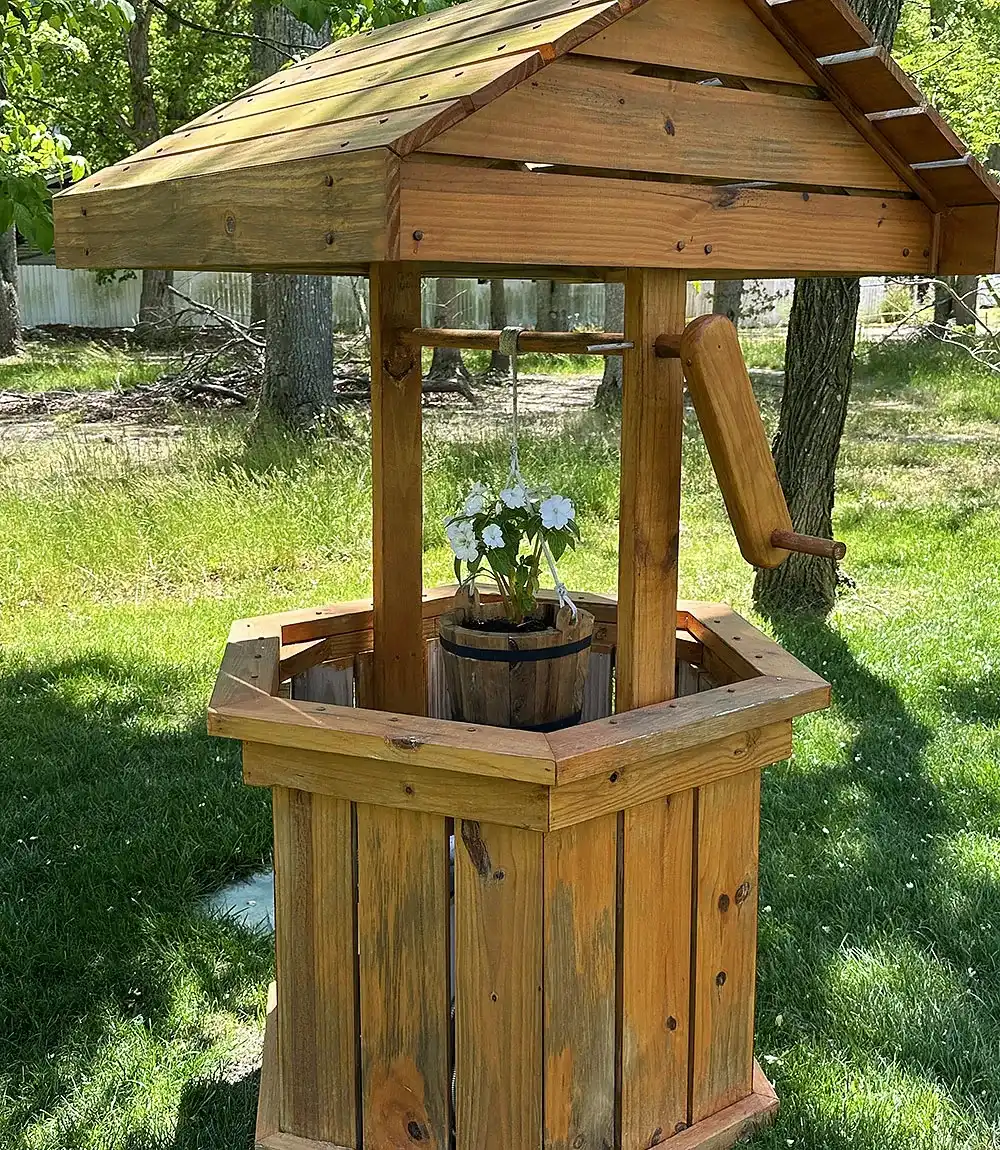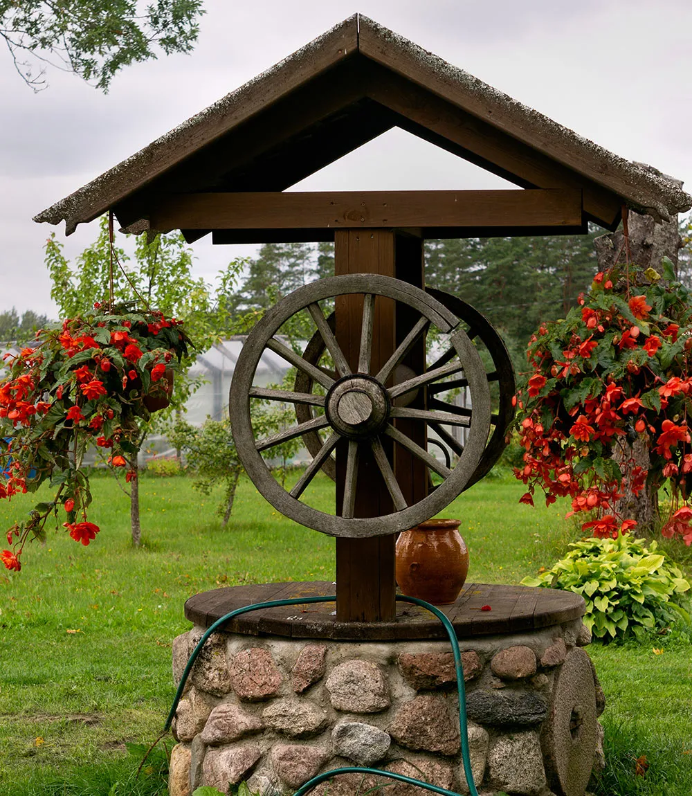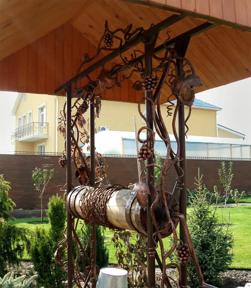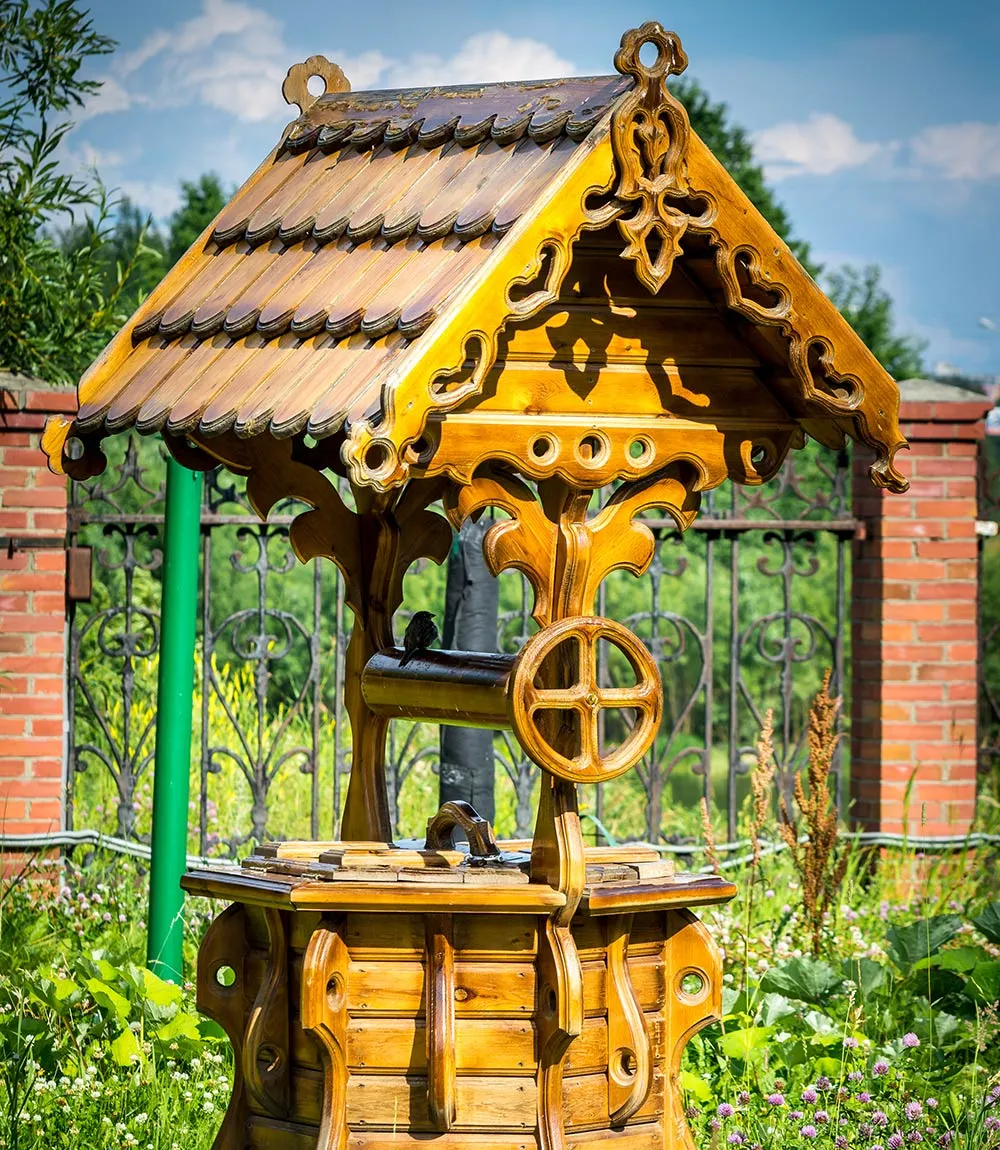 Колодец можно декорировать, добавить резные и кованые элементы. На оголовок можно повесить кашпо с цветущими однолетниками. Рядом с колодцем ― соорудить скамейку, чтобы ставить ведра.