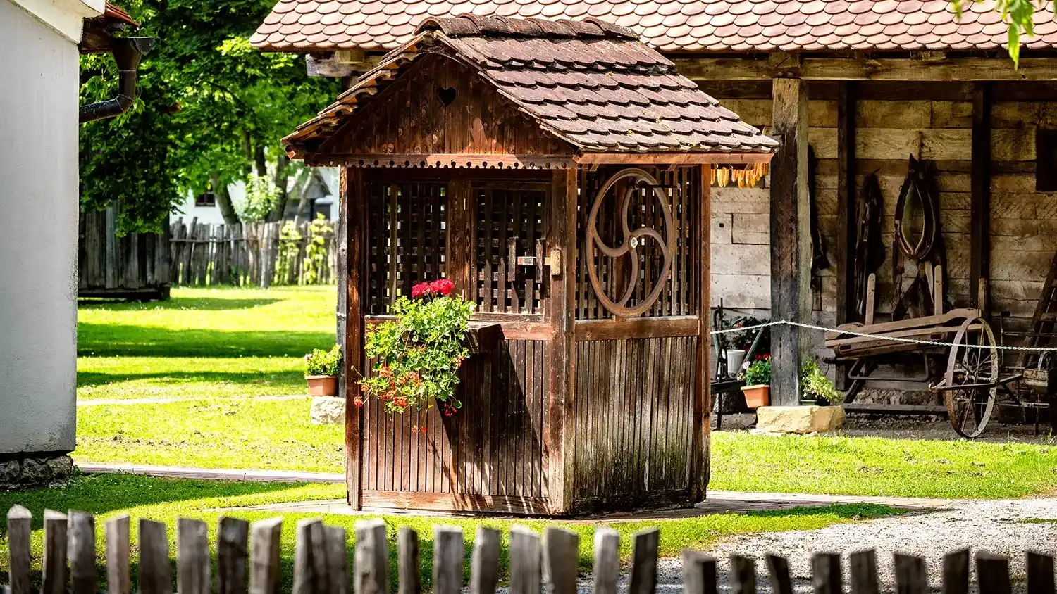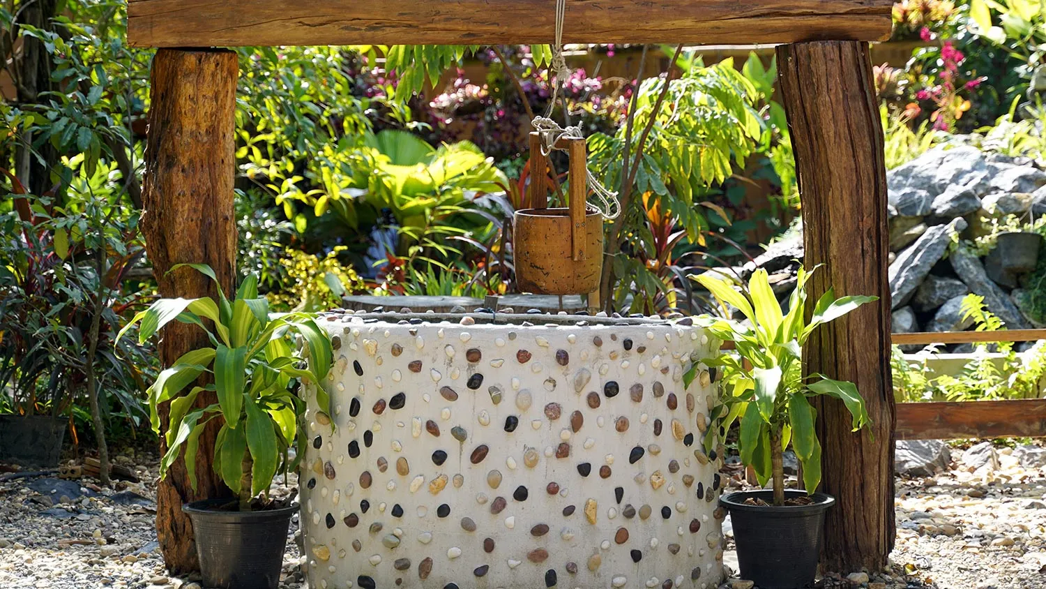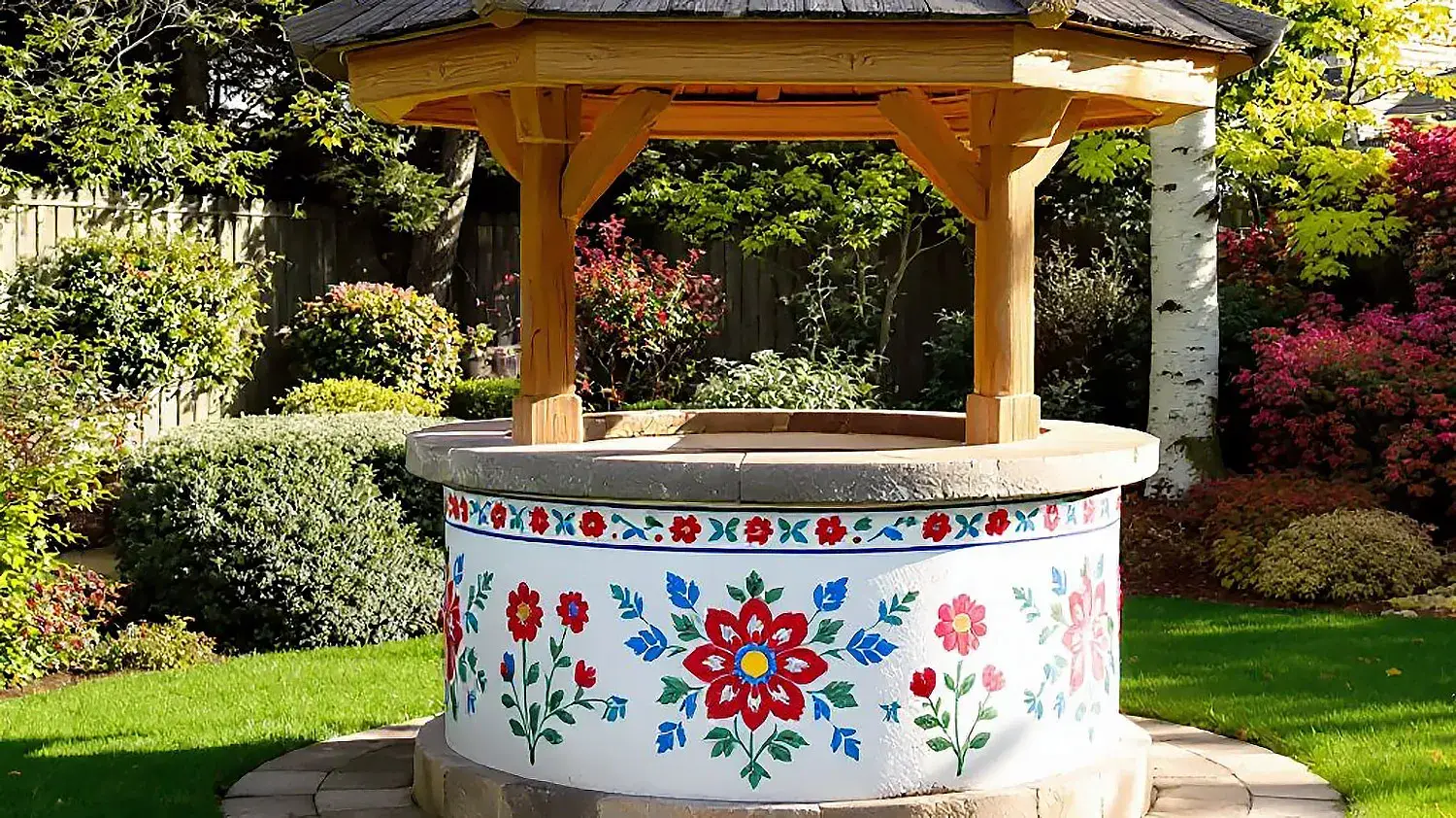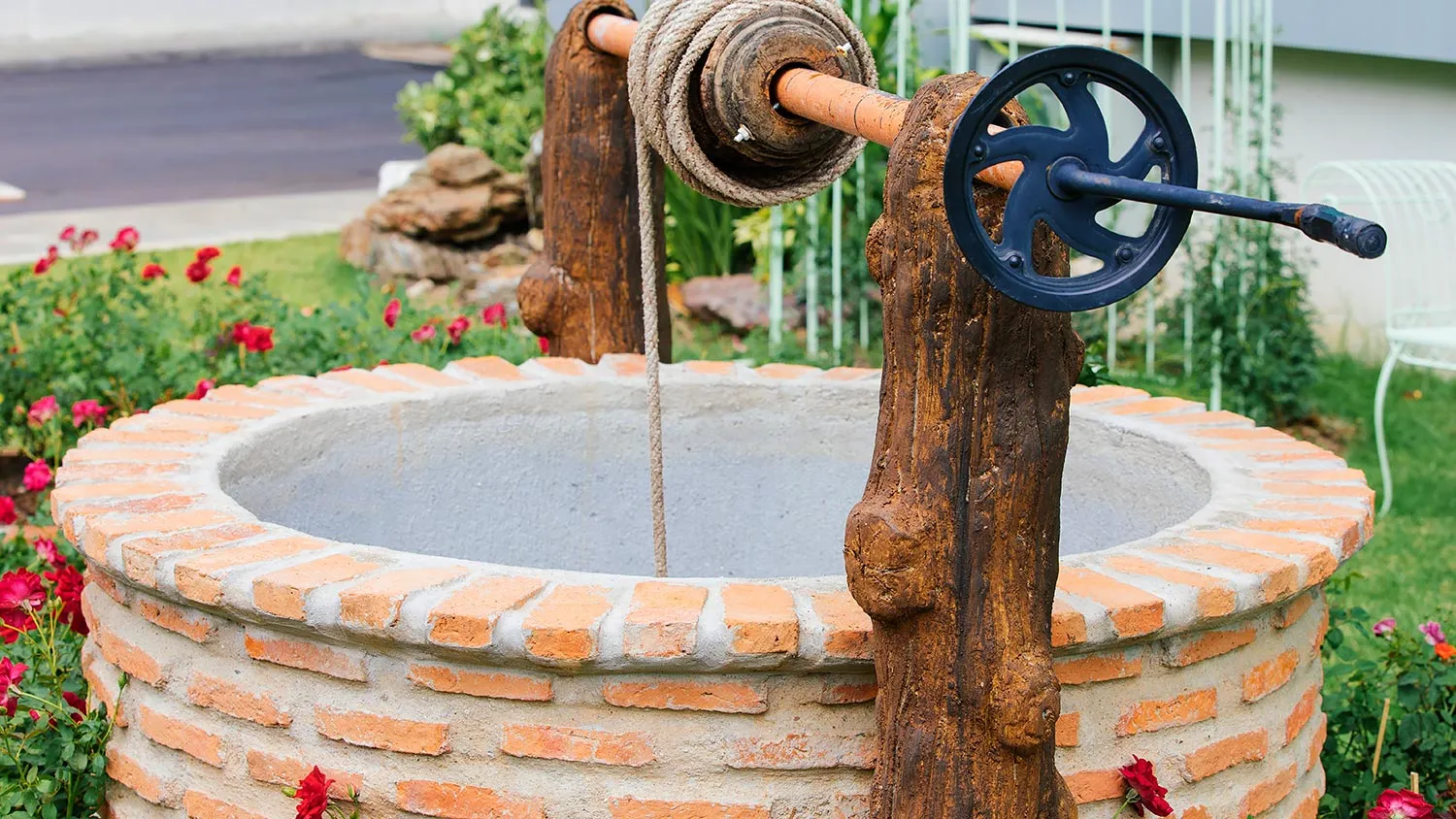 Колодец можно декорировать, добавить резные и кованые элементы. На оголовок можно повесить кашпо с цветущими однолетниками. Рядом с колодцем ― соорудить скамейку, чтобы ставить ведра.