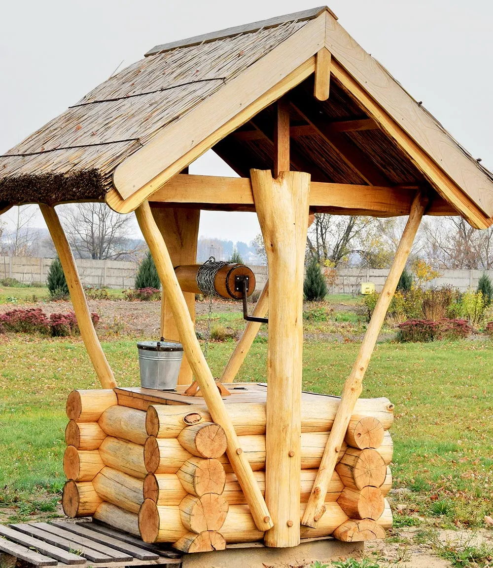 - круглое бревно — делает колодец похожим на сруб, подчеркивает деревенский стиль и гармонирует с деревянными постройками