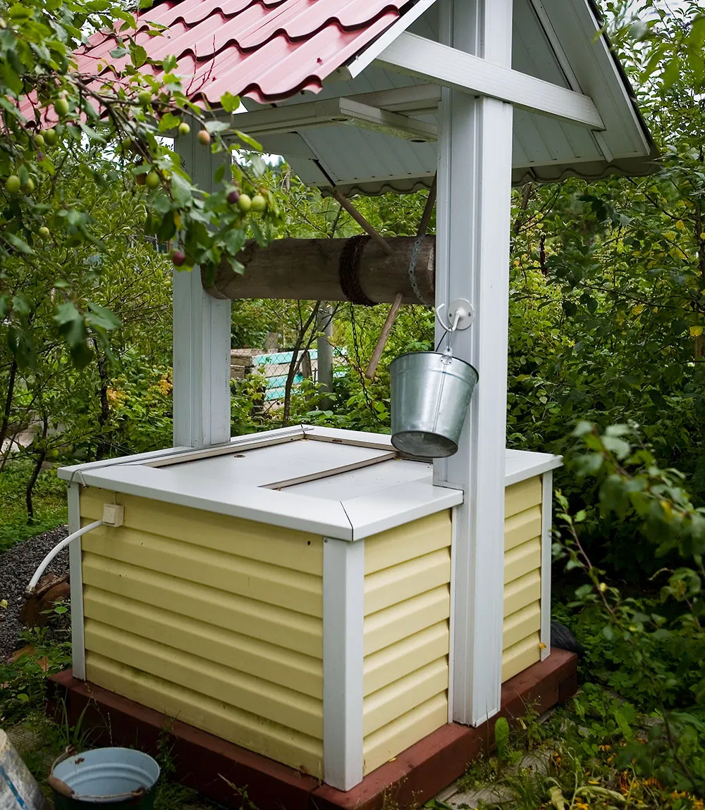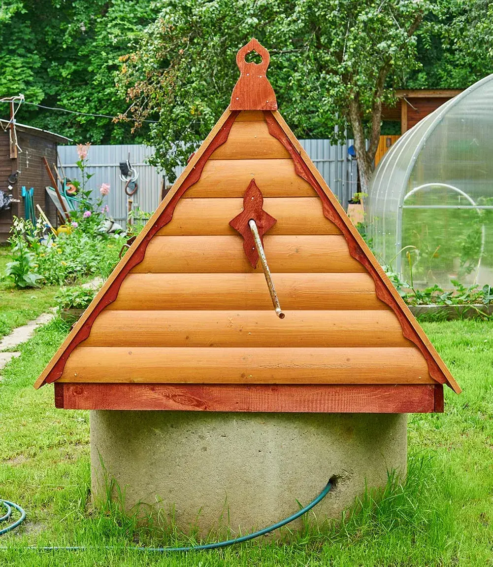 Закрытый домик — эффектный способ оформить колодец на даче. Он полностью накрывает верх, предусмотрена дверца для доступа к воде.