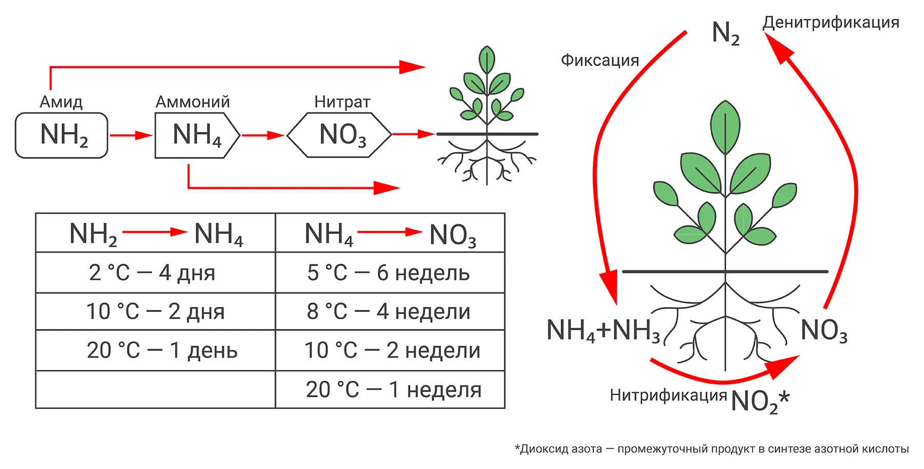 - Аммонийная (NH₄⁺). Этот азот растения не могут поглотить, поэтому он остается в земле, где его перерабатывают почвенные бактерии. Такой процесс называют нитрификацией. За срок от нескольких дней до месяца (зависит от влажности и температуры почвы) аммонийный азот переходит в нитратный и становится доступным для культур.