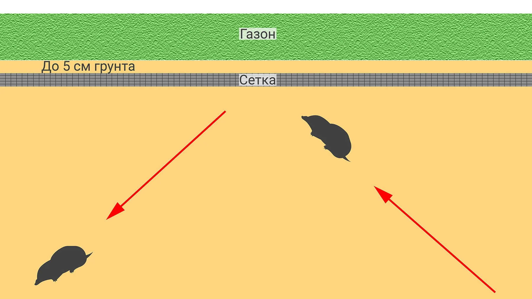 Суть метода — создать подземное ограждение участка или отдельной его территории. Физическая преграда полностью блокирует перемещение зверьков. При столкновении с ней кроты обычно не подкапывают землю ниже, а уводят ход в сторону.
