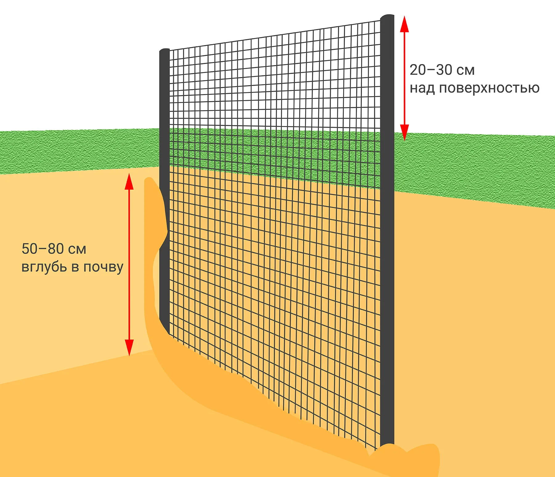 Вертикальный способ подходит для защиты периметра участка. Суть в том, чтобы перекрыть доступ кротам с соседних территорий. Сетку вкапывают по границе на глубину 50–80 см, оставляя 20–30 см над поверхностью, чтобы блокировать попытки зверька переползти через преграду по земле.