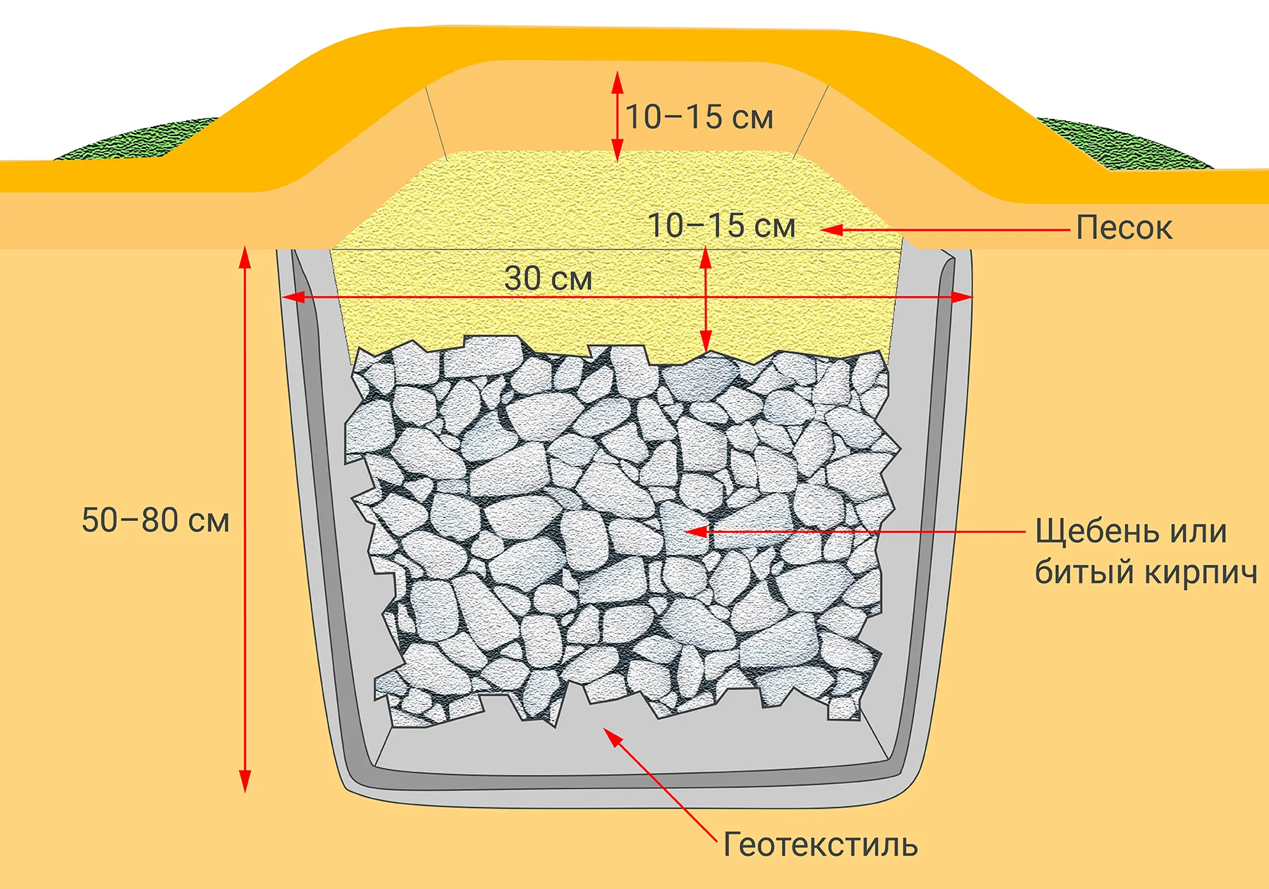 В траншею засыпают щебень фракции 20–40 мм или битый кирпич. Ключевое требование — материал должен быть достаточно крупным, чтобы крот не мог сдвинуть отдельные элементы, но и не слишком мелким, чтобы не уплотняться в почвенную массу. Нестабильность и подвижность наполнителя создают для животного непреодолимое препятствие: при попытке прокопать ход камни осыпаются и заваливают тоннель.