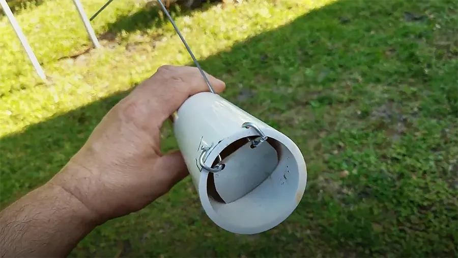 - Ловушка-труба. Это покупное или самодельное устройство, которое вставляют в кротовую нору как ее продолжение. Крот заходит внутрь и оказывается в западне, так как дверцы открываются только внутрь. Изготовить самостоятельно такую ловушку можно из канализационной трубы. Диаметр берите близкий к размеру естественного хода — около 50 мм. Из тонкого металла или пластика вырежьте два круга чуть меньшего диаметра и закрепите их с торцов на проволоку. Снизу дверцы зафиксируйте еще одной оцинкованной проволокой, препятствующей раскрытию наружу. Важно убедиться, что внутри трубы нет острых краев ― кроты их боятся. Все крепления должны остаться снаружи.