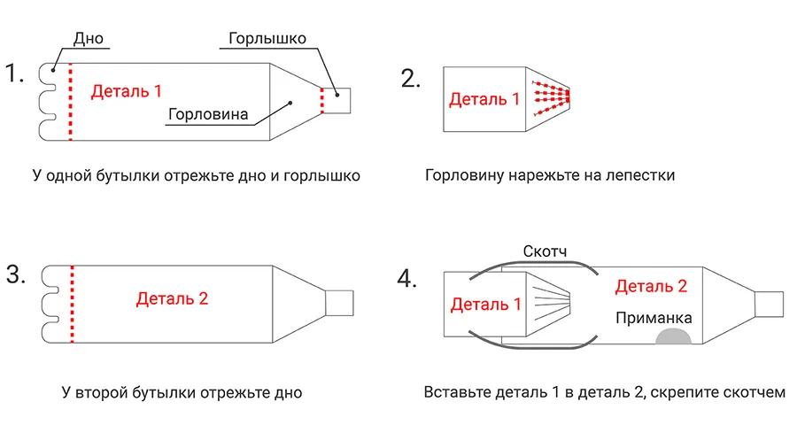 - Ловушка из пластиковых бутылок. Самый простой и бюджетный вариант. Возьмите две пластиковые бутылки объемом 1,5 литра. У первой отрежьте дно и горлышко, а горловину разрежьте на 8 лепестков. У второй бутылки удалите только дно. Первую деталь вставьте во вторую, стык скрепите скотчем. Внутрь положите приманку, например дождевых червей. Лепестки легко пропустят зверька, а затем надежно закроют выход.