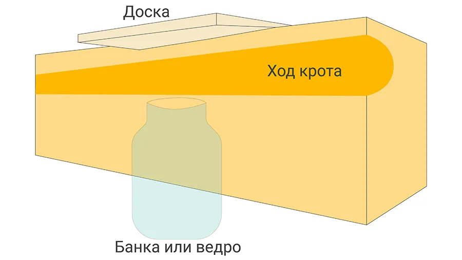 - Метод ямы. В действующий ход крота вертикально вкопайте трехлитровую стеклянную банку или пластиковое ведро. Важно разместить емкость так, чтобы края были на уровне дна хода. Крот пробегает по туннелю, падает в банку и не может выбраться.