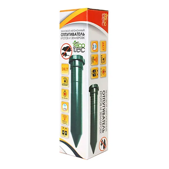 В магазинах можно также найти ультразвуковые отпугиватели. Принцип работы этих устройств основан на излучении ультразвука в грунт с целью создать зону акустического давления, неприятную для чувствительного слуха крота. Приборы вставляют в землю вертикально, как колышки, ближе к норам и выходам.