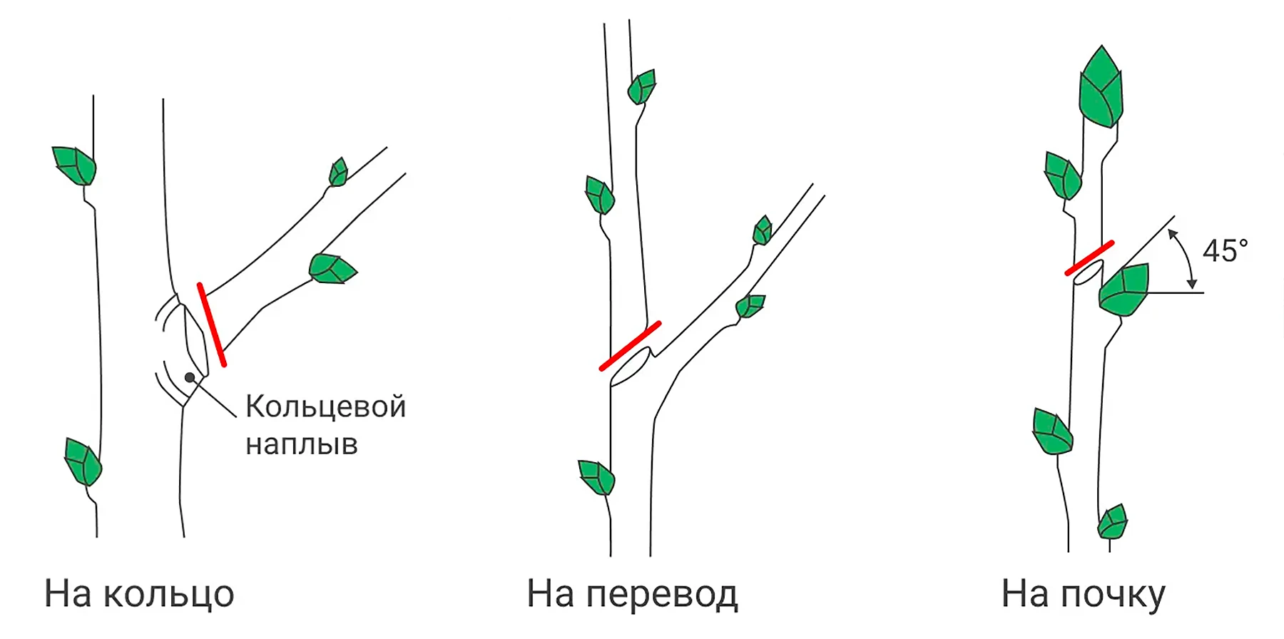 - «На кольцо» — срез делают по кольцевому наплыву, не оставляют пеньков и в то же время не задевают ткань ствола. Технику используют, когда нужно полностью убрать побег. Торчащих кончиков быть не должно: они высыхают и запускают в ткани инфекцию.