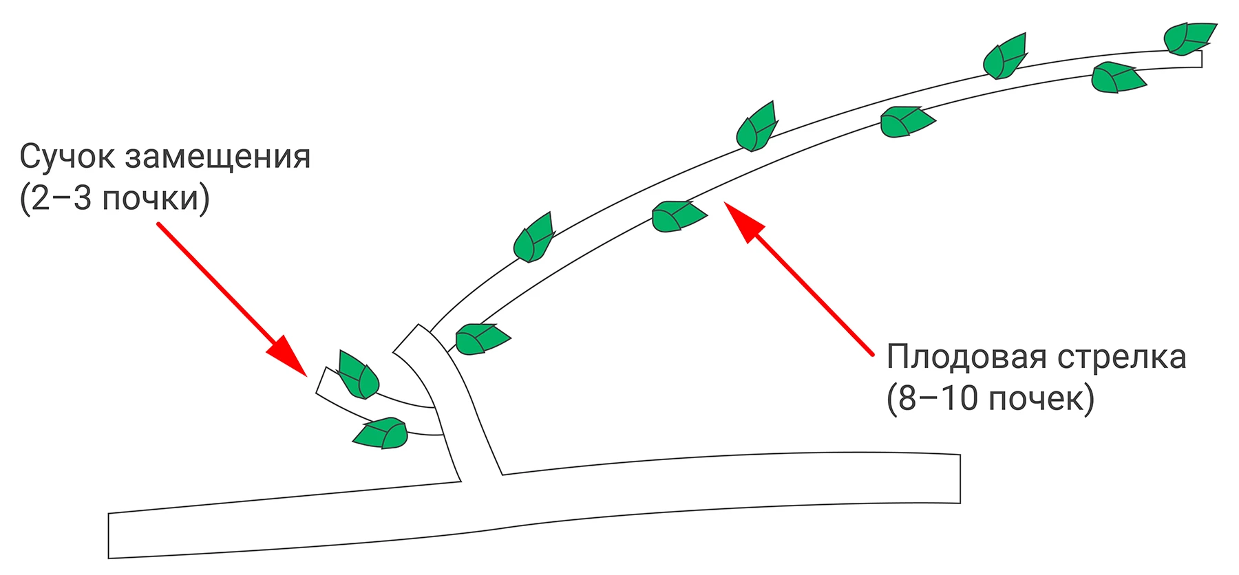 - Выберите сильный отросток на многолетнем скелетном побеге и укоротите его на 8–10 почек от основания.