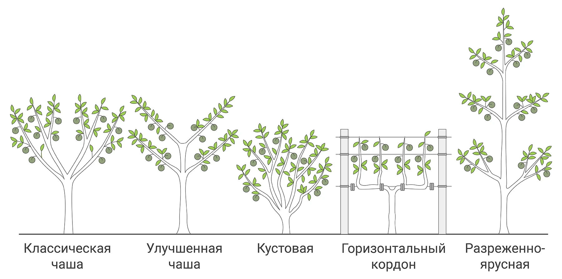 - Улучшенная чашевидная — снижает риск разломов, так как скелетные ветви в этом случае отходят не из одной точки, а ярусно, на расстоянии 10–20 см друг от друга. Уход и ежегодная обрезка такие же, как для обычной чаши.