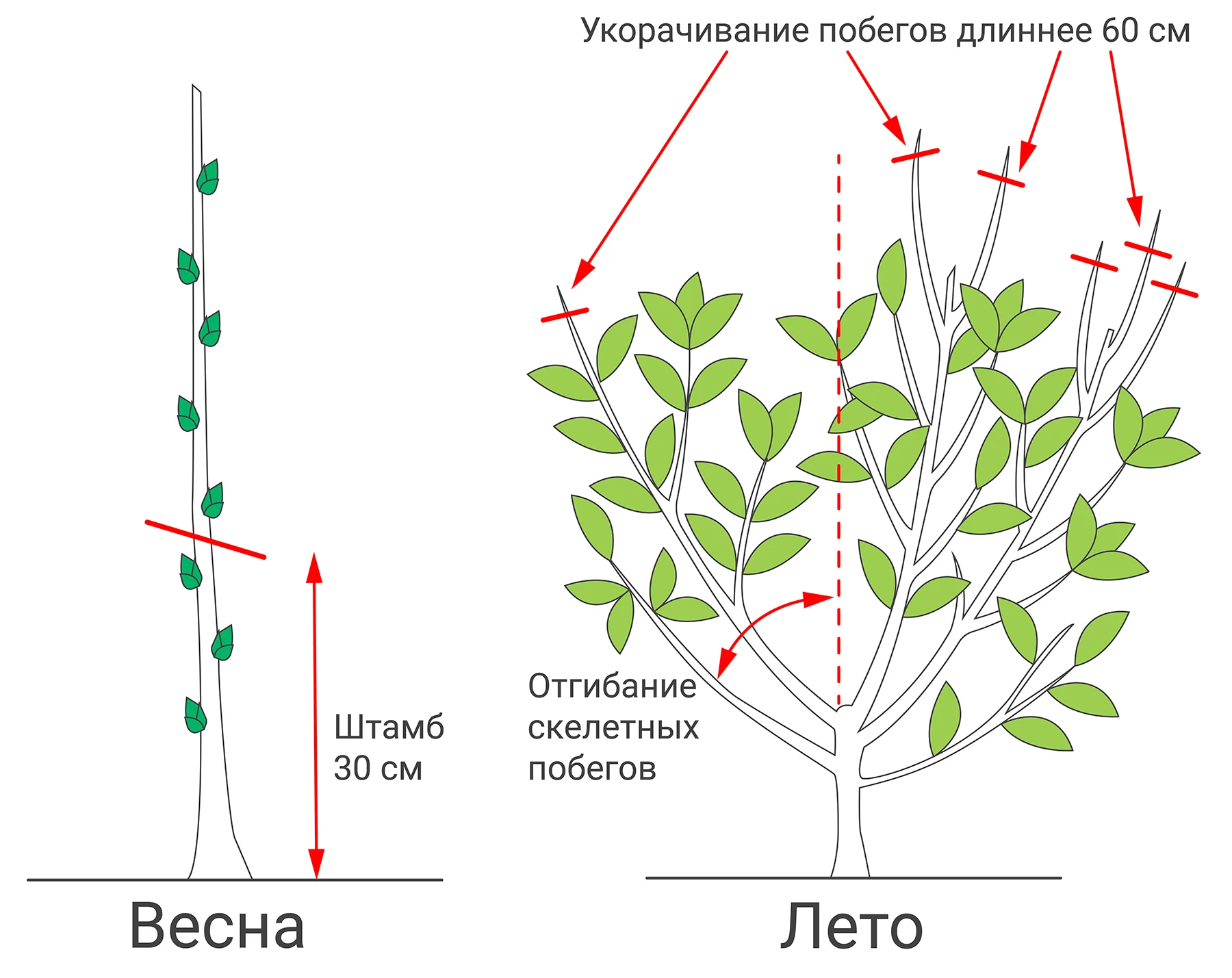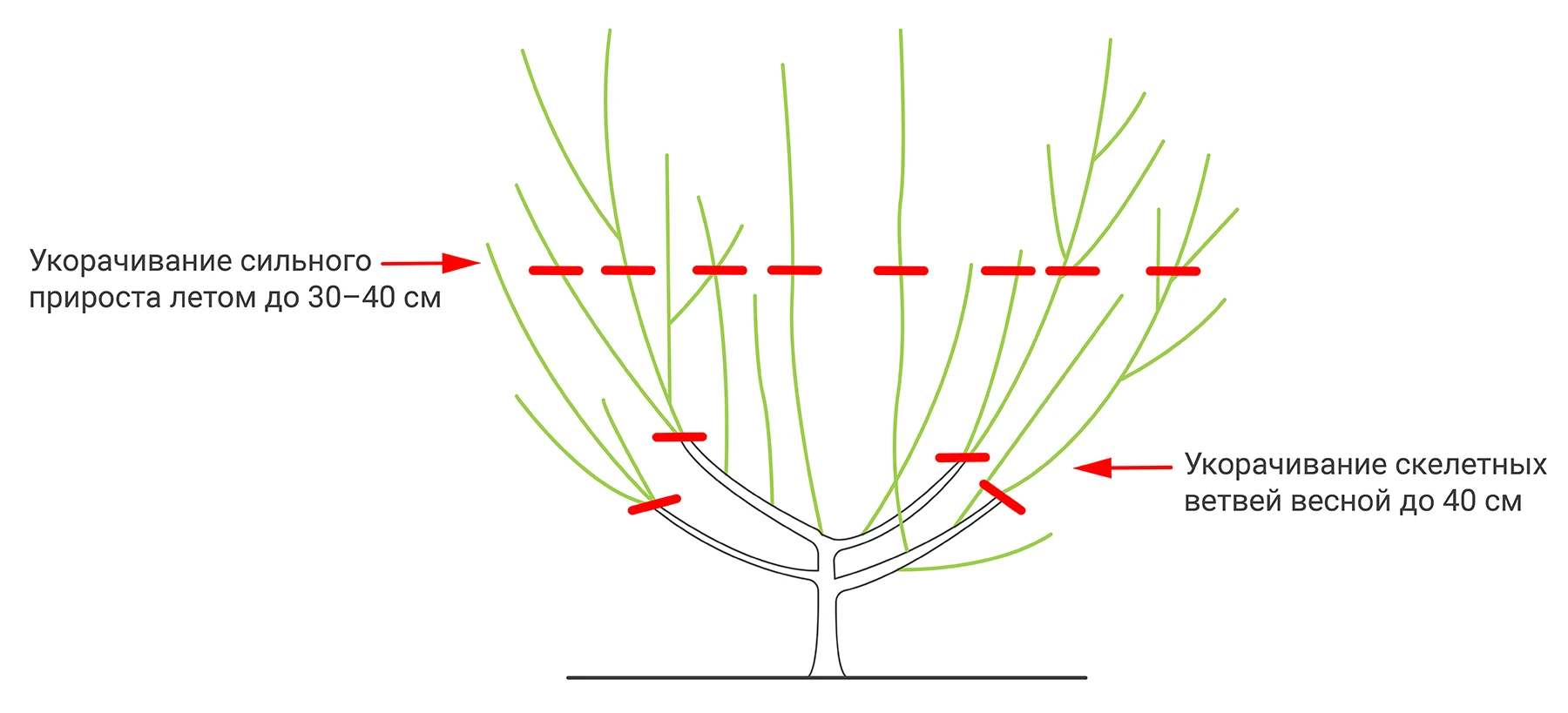 С середины июня до начала июля прищипывают макушки, срезают всю мелочь, вертикальные (жировые побеги, они же волчки) и загущающие ветки, растущие внутрь. Нужно оставить сильные и хорошо расположенные побеги. Дерево перенаправит питание к ним, и они станут достаточно сильными, чтобы успешно перезимовать и дать качественный урожай в следующем году. А на случай неудачной зимовки это станет страховкой — следующей весной вы обрежете лишнее и нормируете количество плодовой древесины.