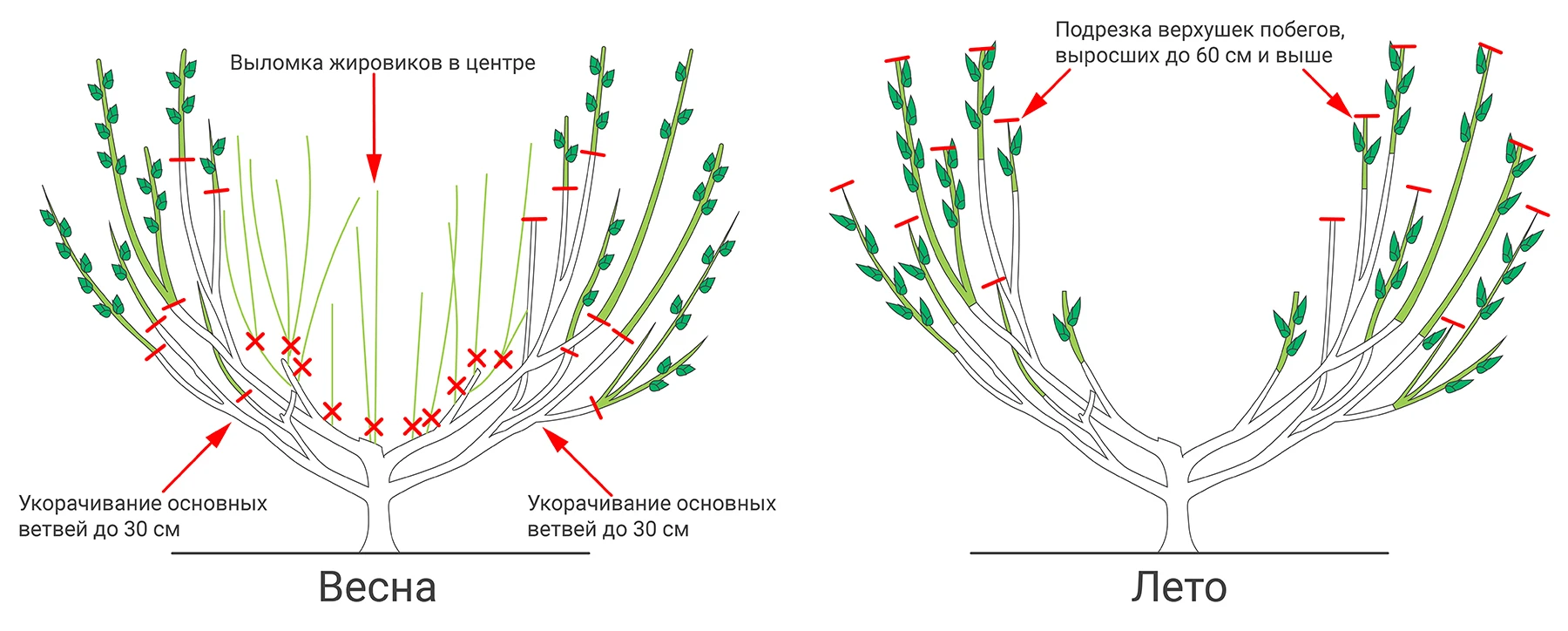 Ухаживать за растением нужно в течение всего сезона, особенно после обрезки. Оно нуждается в поливе, умеренном питании, защите от грибков, вредителей и зимних морозов.