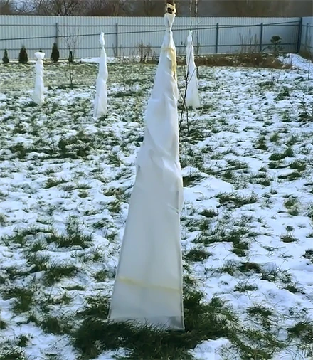 - Не укутывайте деревце слишком рано, пока еще тепло. Приступайте к работе, когда днем будет стабильно -5...-10 °C. Если поторопиться, побеги под укрытием могут начать преть.