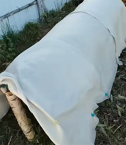 - Накройте каркас белым агроволокном высокой плотности в несколько слоев. Между ветками и укрывным материалом нужен зазор минимум 10–15 см.