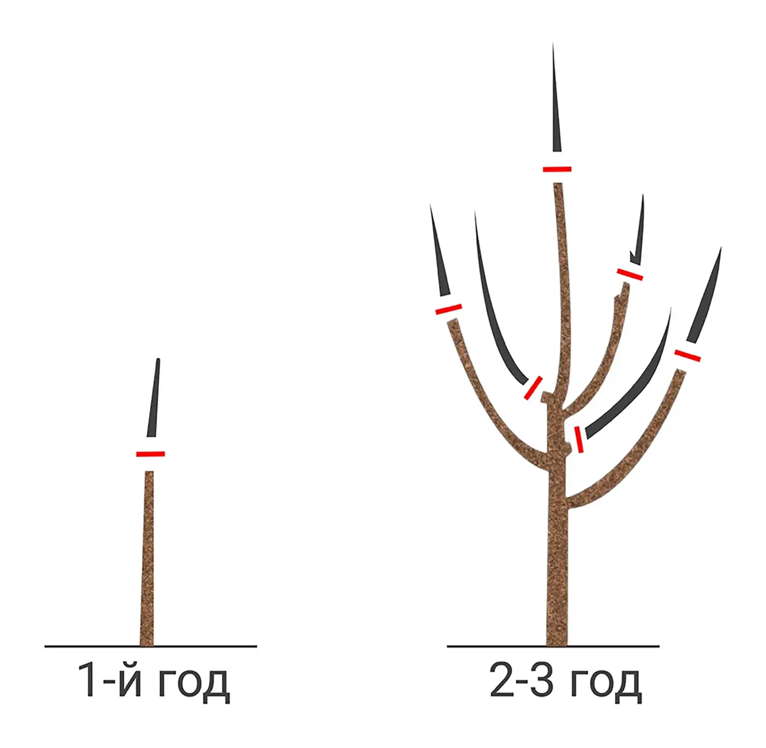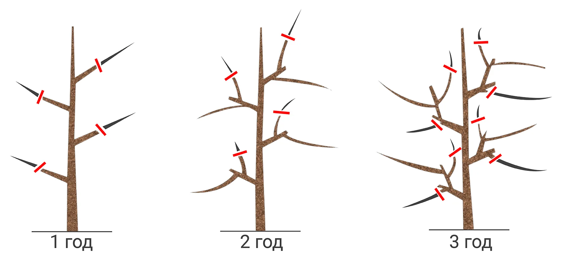 - У двухлетнего выберите 3–4 сильные ветви. Лучше, если они смотрят в разные стороны. Если нет — их можно аккуратно развести и зафиксировать, при условии, что они уже достаточно крепкие. Укоротите будущие скелетные ветви на 1/3, чтобы они начали куститься.