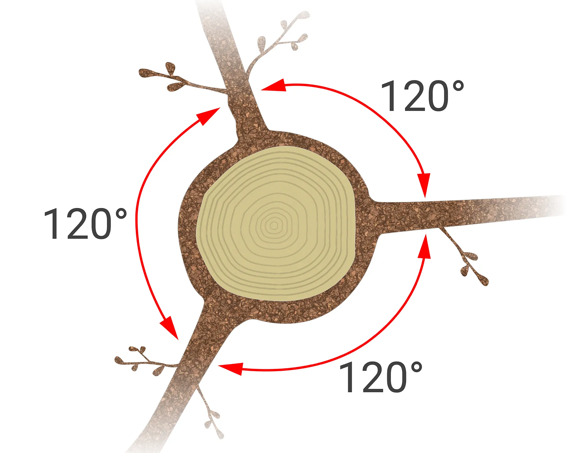 - Следите за углом отхождения ветвей. Он должен быть в пределах 45–60 градусов. Слишком острые развилки часто ломаются под урожаем.