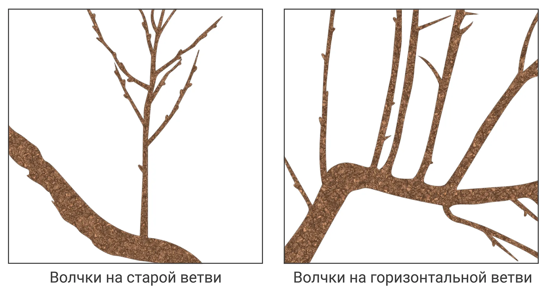 - Удалять волчки — жирные, мощные побеги, которые растут вертикально вверх из спящих почек на старых ветках или на стволе. Они никогда не плодоносят, просто тратят ресурсы. Их нужно вырезать без пенька. Исключение одно: если дерево сильно замерзло, то некоторые волчки оставляют, чтобы отогнуть под правильным углом и сформировать из них новую крону. Но этот подход — уже для опытных садоводов.