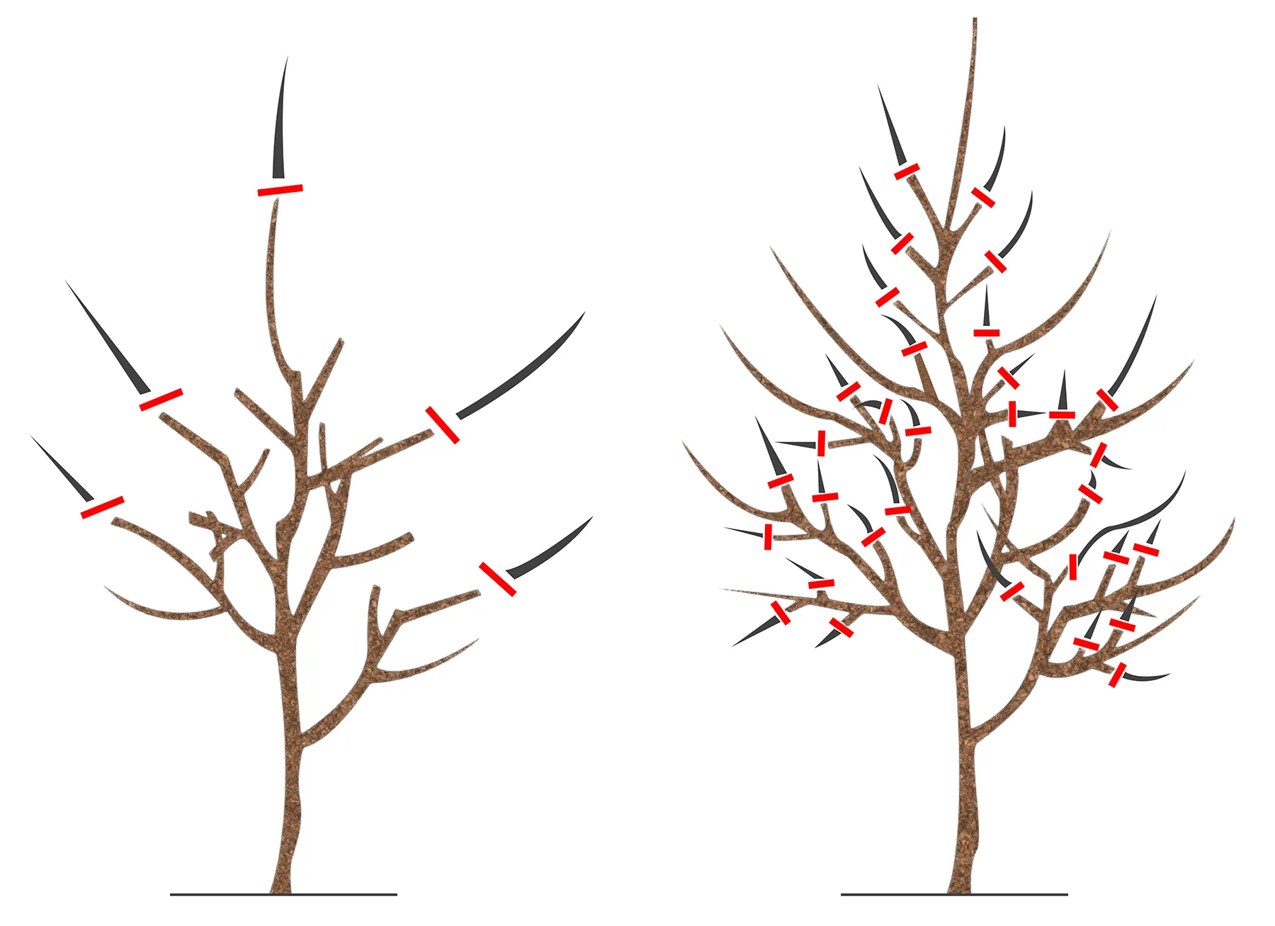 - Длинные вертикальные побеги, выросшие в прошлом сезоне, прищипывайте или переводите на короткий прирост.