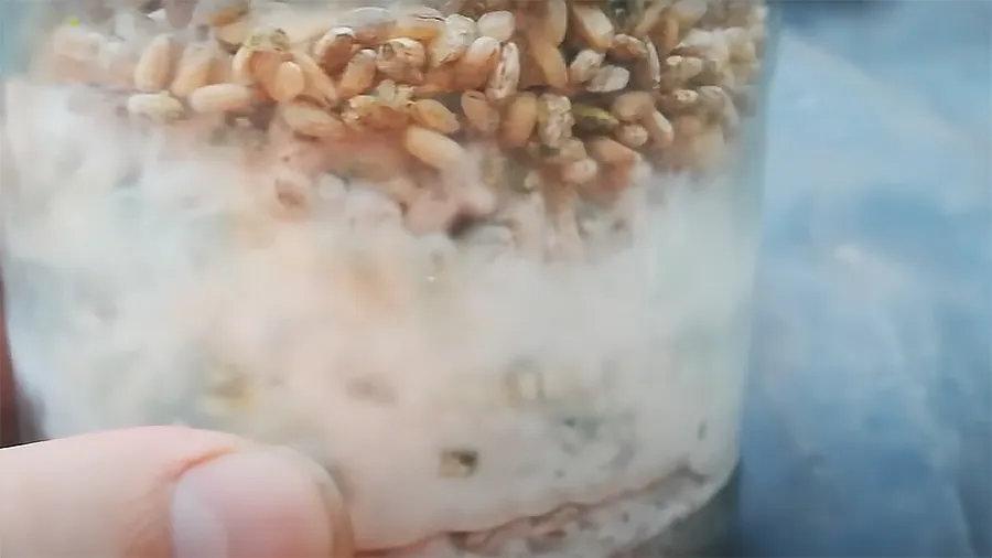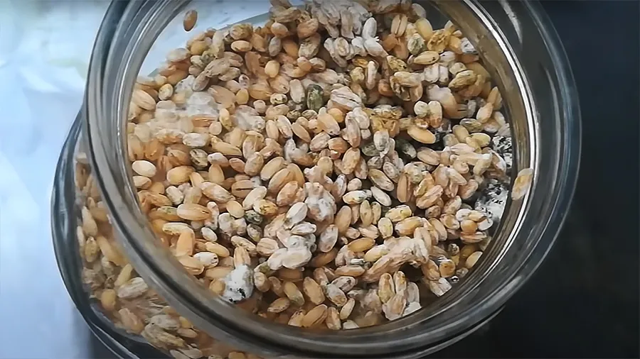 На 3–4 день станет заметен рост мицелия. Если он замедлится или зерно пересохнет, добавьте в банку несколько столовых ложек кипяченой подслащенной воды. Если биопрепарат качественный, через неделю субстрат начнет покрываться спорами и менять цвет на зеленый или серый (зависит от вида гриба). Это может произойти и быстрее — в зависимости от условий, в которых вы храните заготовку. В таком виде из крупы уже можно готовить раствор.