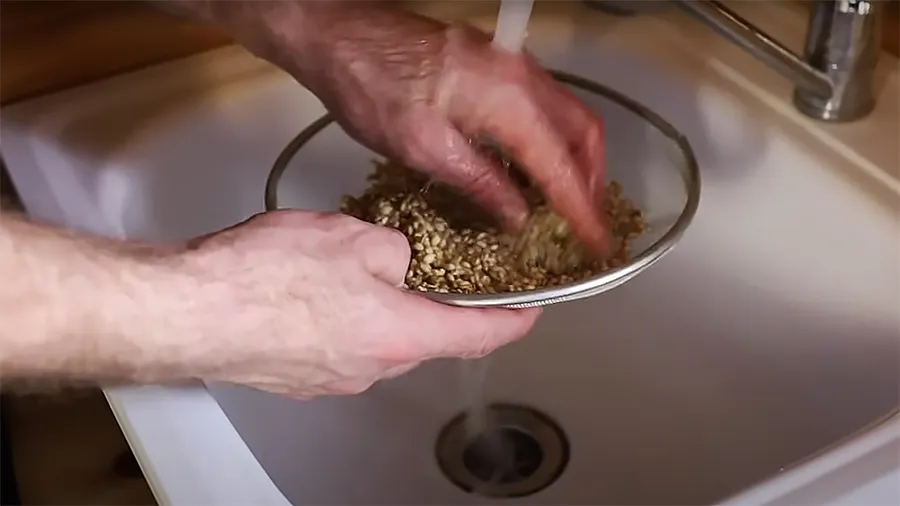 Перловую крупу промойте под проточной водой в сите. Это уберет пыль и грязь.