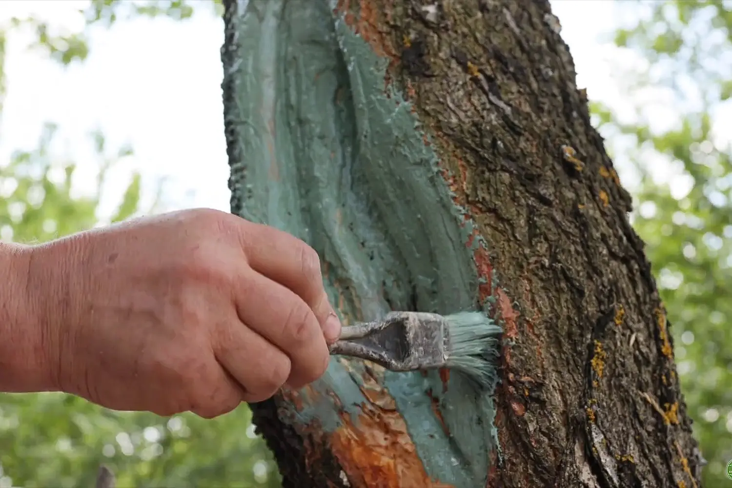 Окрашивание и укрытие штамбов — не менее важный этап в подготовке сада к зиме. На стволы и ветки наносят специальную смесь, которая создает барьер от холода и ультрафиолета. Такая обработка не дает появляться морозобоинам и удерживает в коре влагу.