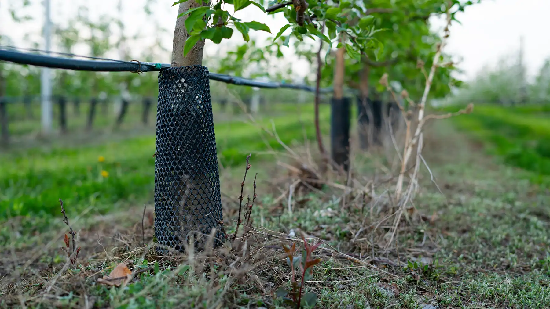 - Механические барьеры. Оберните стволы защитной сеткой (металлической или пластиковой) с ячейками до 1 см на высоту 50–70 см от земли.