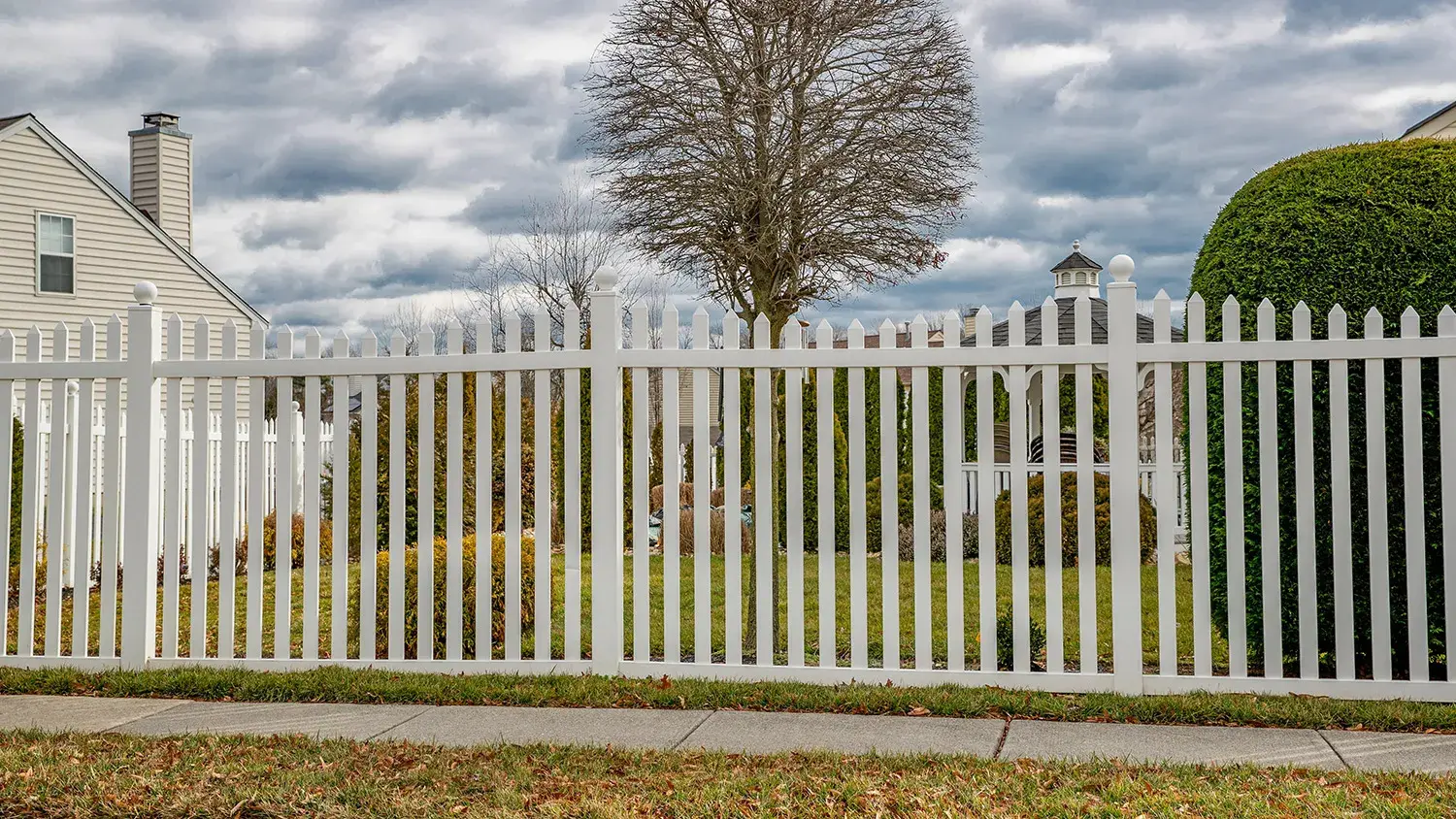- Пластиковый — не боится осадков, легко монтировать, стоит дешевле остальных вариантов. Может выцветать на солнце и трескается при сильном ударе или морозе. Средний срок службы качественного пластикового штакетника — 10–15 лет.