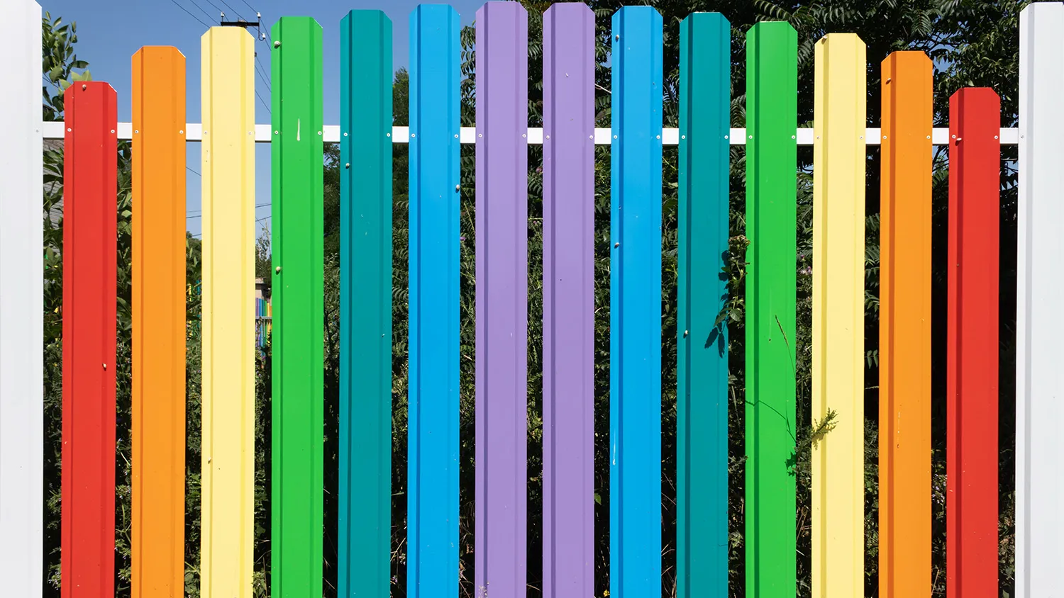 - Однотонные штакетины — самый распространенный вариант. Чаще используют белый, коричневый, серый, зеленый или бордовый. Это универсальные цвета, которые подходят для любых домов и участков.