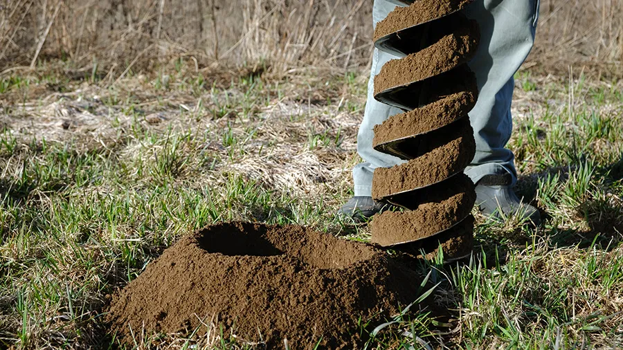 На каждом отмеченном месте пробурите отверстие под столб. Диаметр лунки — 15–20 см. В работе поможет садовый ямобур.