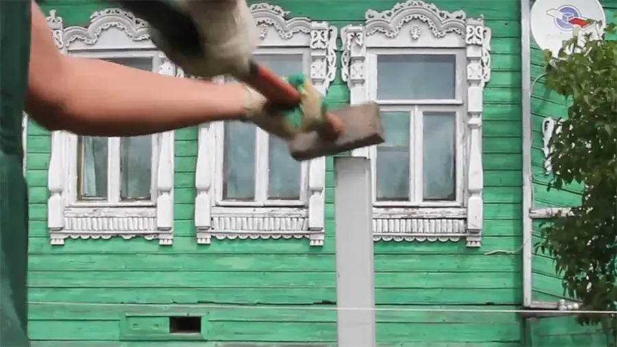 Аккуратно установите столбы в лунки. Если необходимо небольшое заглубление или уплотнение, используйте кувалду. Забивайте через деревянную прокладку или специальную насадку, чтобы не повредить верхний край трубы и ее защитное покрытие.