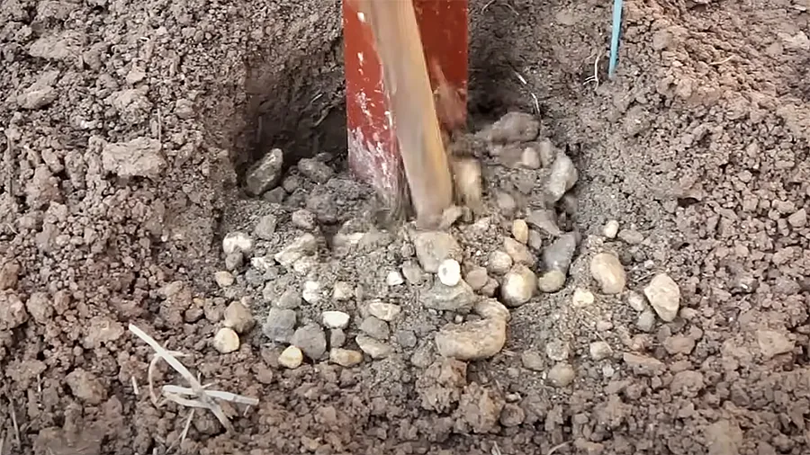 Закрепите столб. Поэтапно засыпайте щебнем и плотно трамбуйте. Если конструкция массивная или грунт рыхлый — залейте бетоном, приготовленным в указанной пропорции.