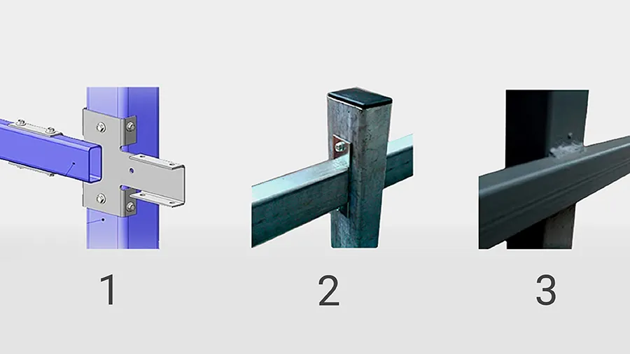 1 — Х-кронштейн, 2 — монтаж на уголок, 3 — сварка к столбу. Источник: YouTube | Евроштакетник Забор без Забот
