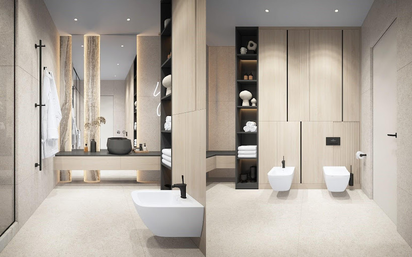 Как ни странно, пропорция 70/30 не работает в ванной комнате. Там лучше использовать один вид дерева: например, только дуб или только орех — породы, которые хорошо переносят влажность. Дело в том, что санузел обычно гораздо меньше спальни или гостиной, а в маленьком помещении две породы дерева будут спорить друг с другом, перетягивая внимание, и плохо сочетаться с плиткой или керамогранитом.