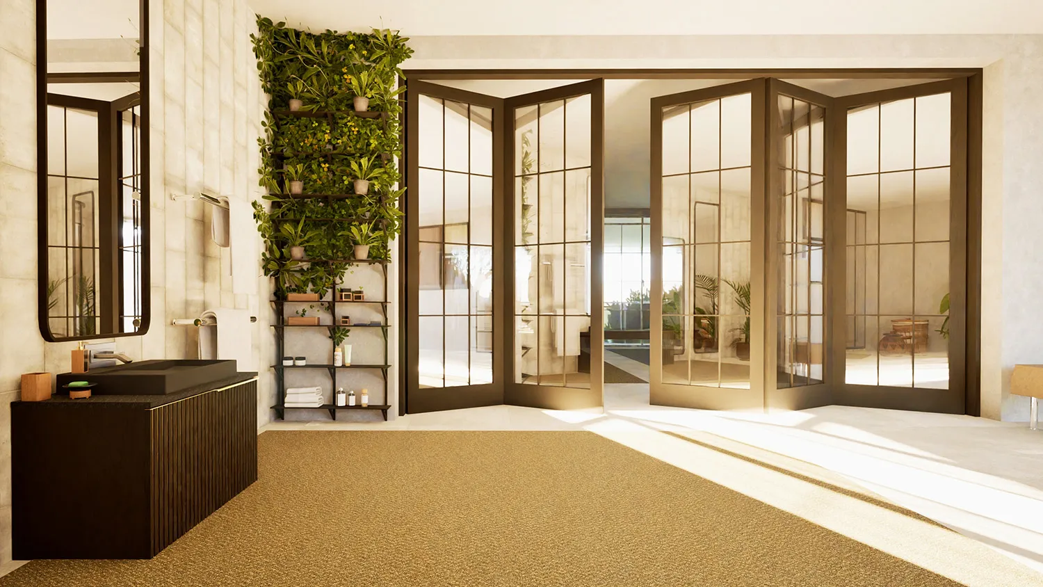 Ключевую роль в создании антуража экостиля играют окна и двери. Их задача — подчеркнуть философию единства с окружающим миром, обеспечить простор и уют, а также наполнить помещение обилием естественного света.