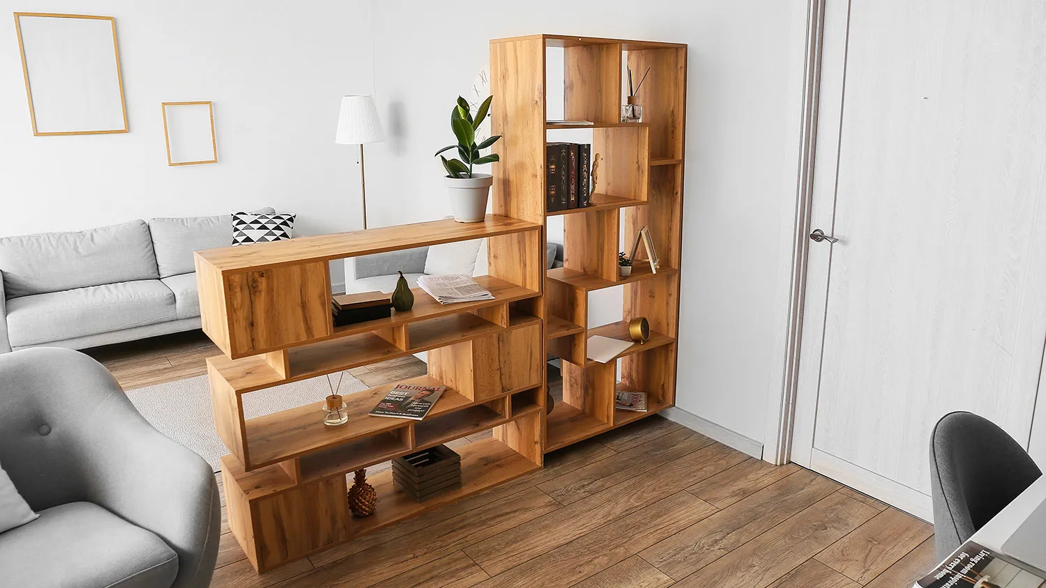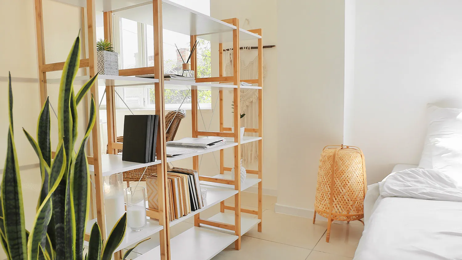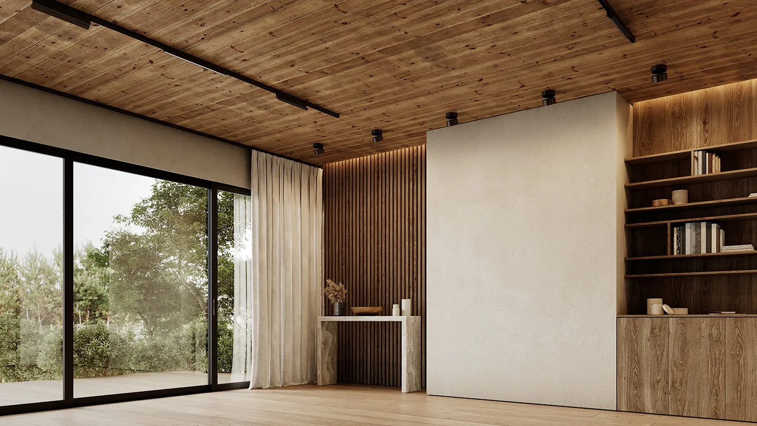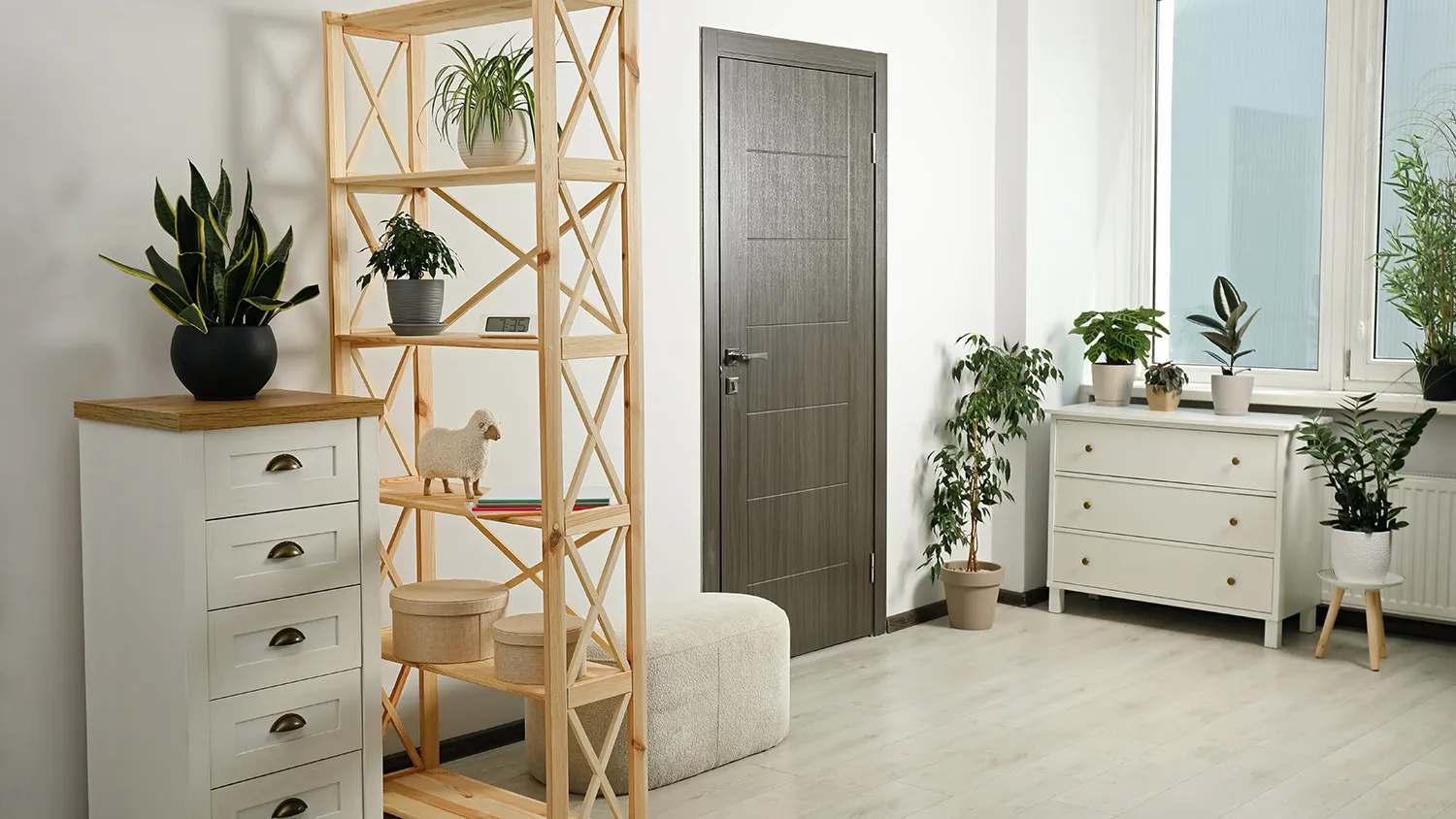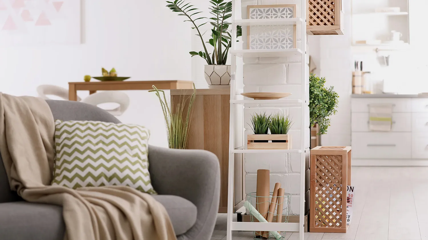 Выбирайте отделку с имитацией природных поверхностей или однотонные светлые покрытия. Для хранения предпочтительнее этажерки и стеллажи с открытыми полками или лаконичные шкафы.