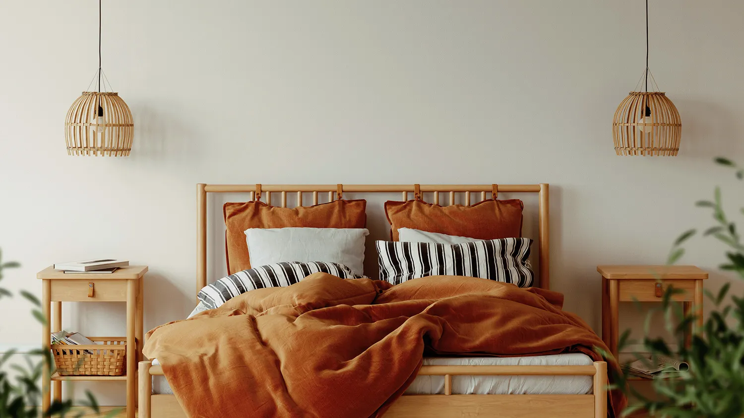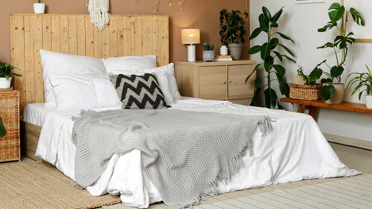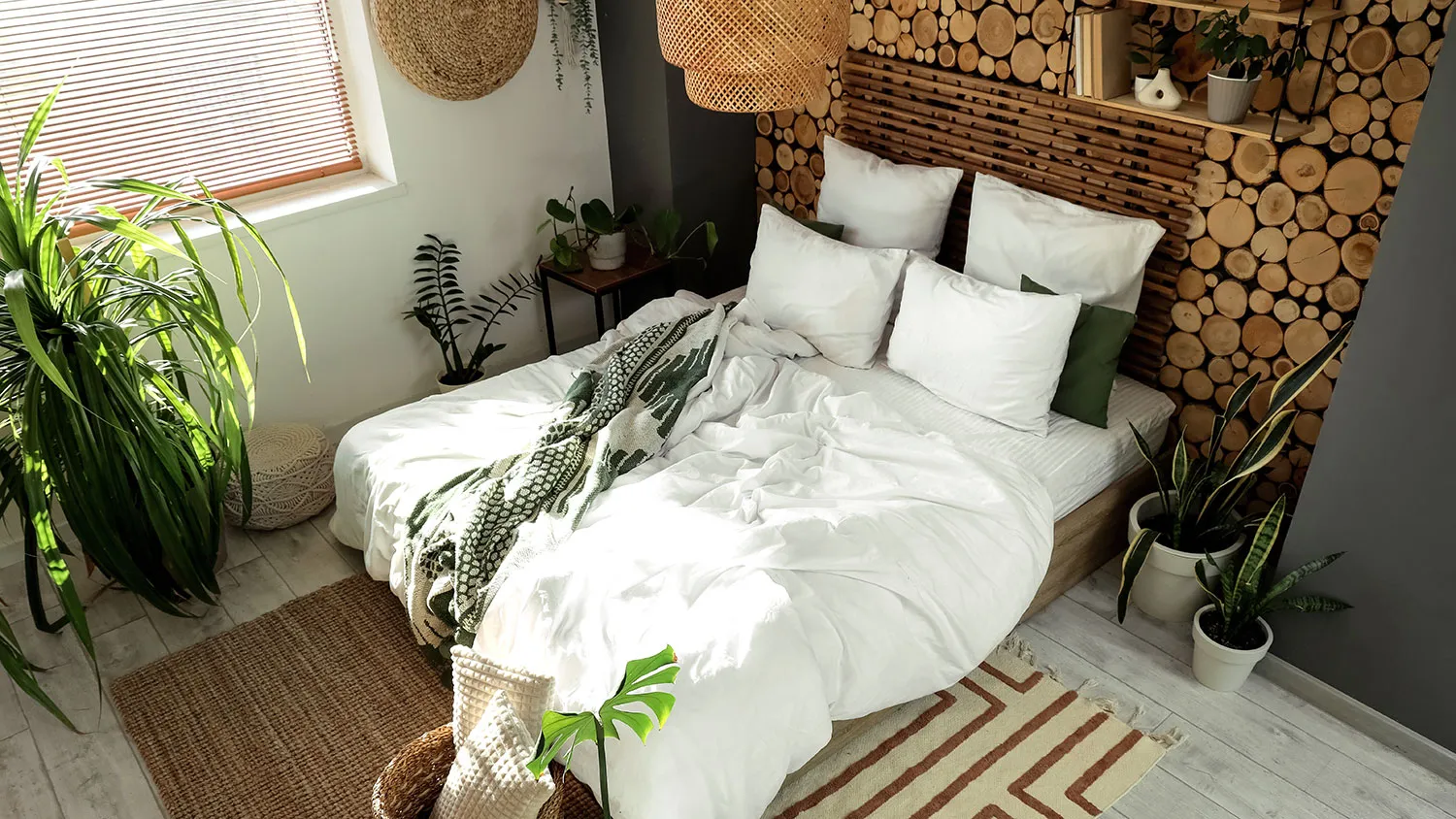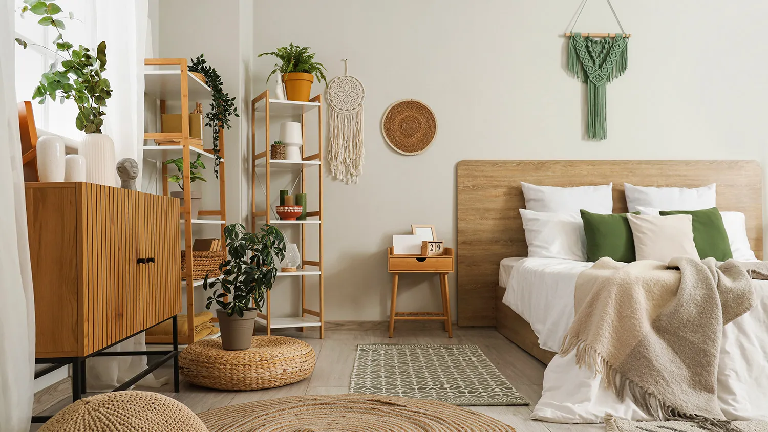 Главный предмет комнаты для сна — просторная удобная кровать. Для экостиля выбирайте модели с каркасом из дерева или бамбука и обивкой из текстиля или экокожи.