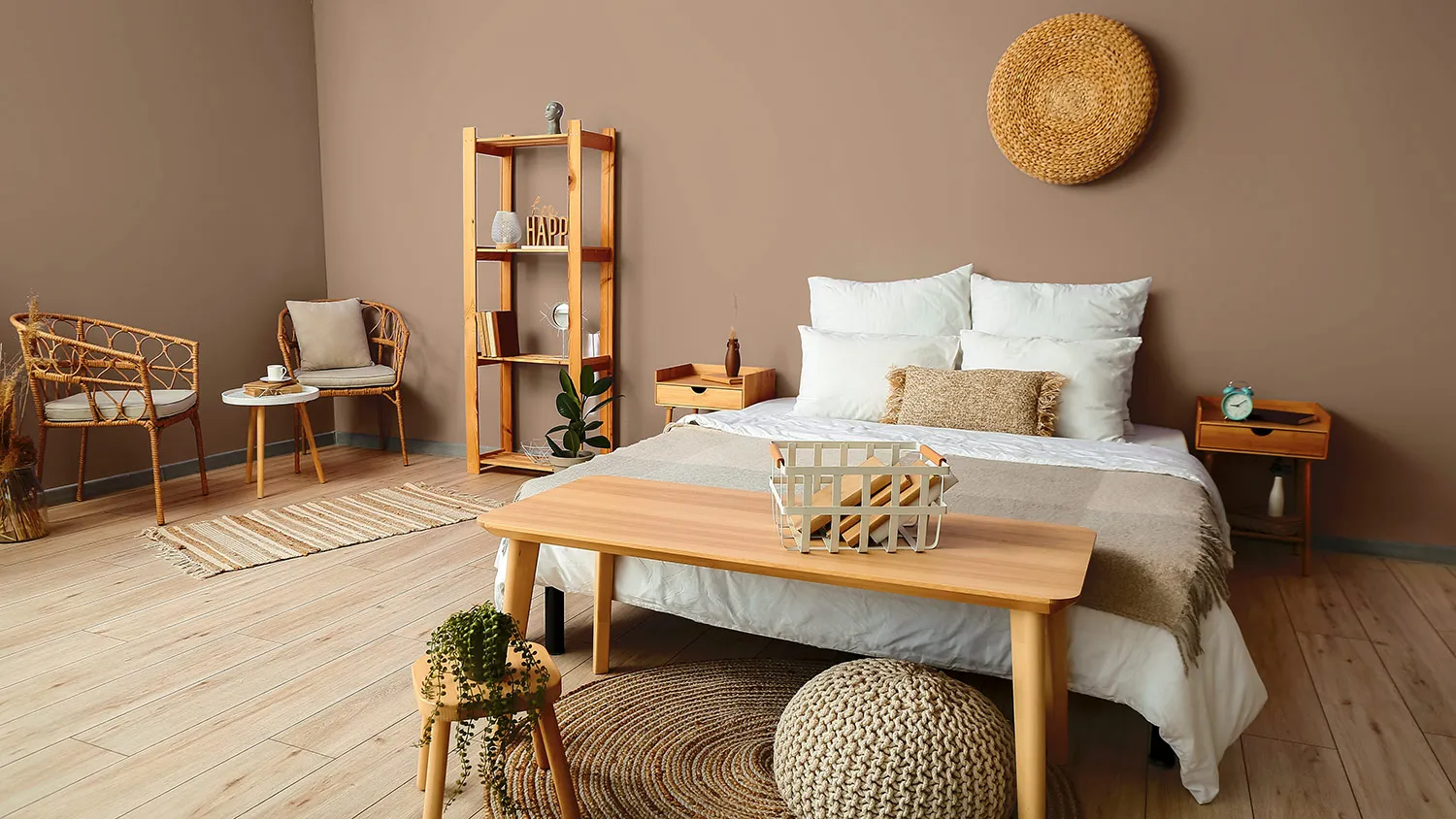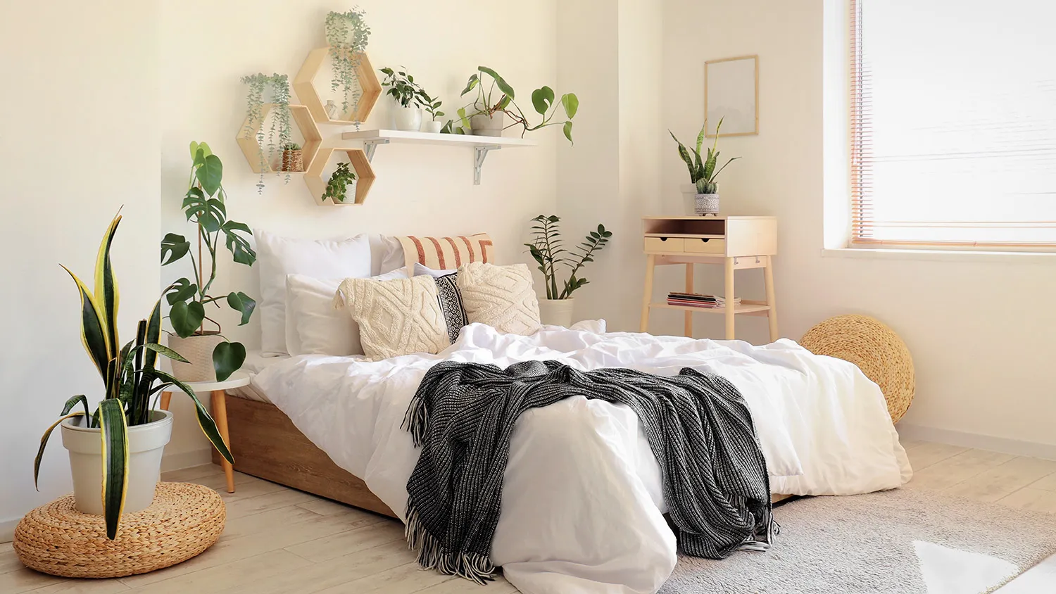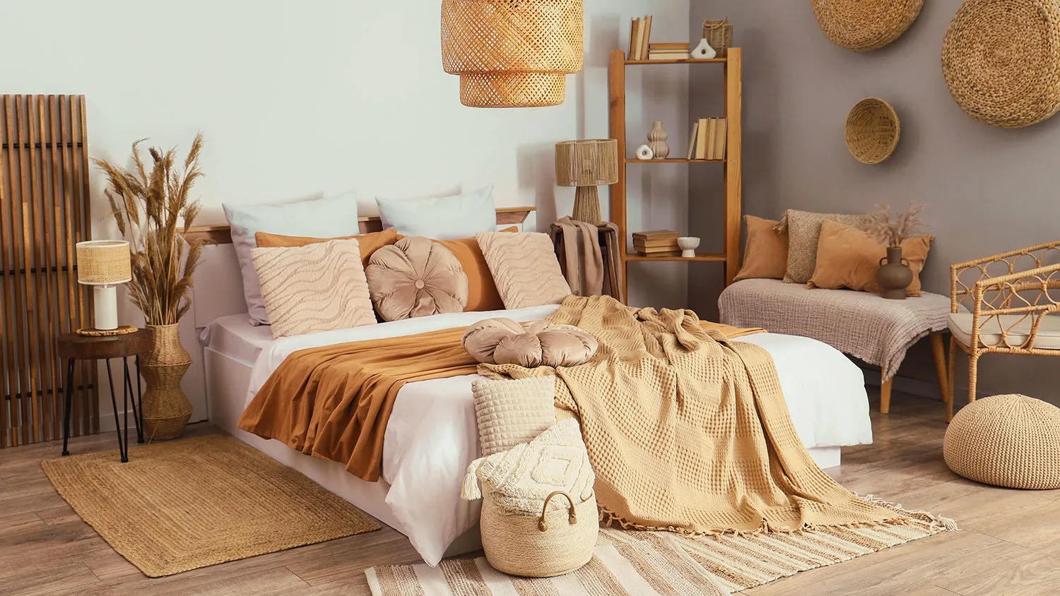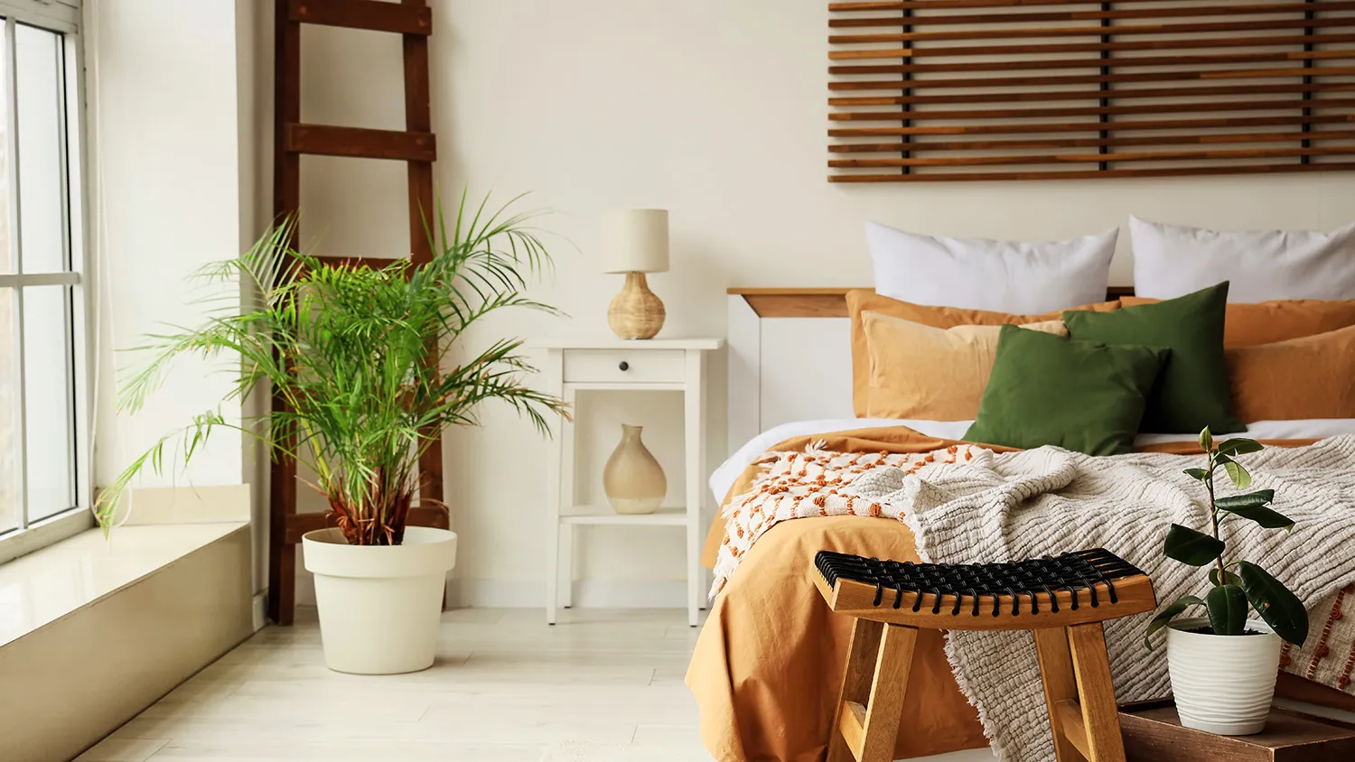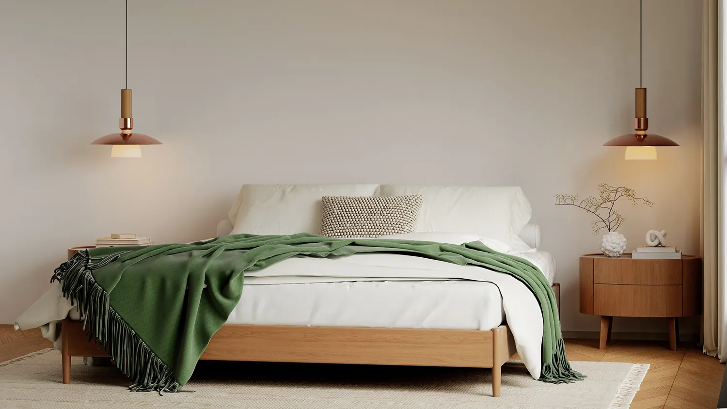 Главный предмет комнаты для сна — просторная удобная кровать. Для экостиля выбирайте модели с каркасом из дерева или бамбука и обивкой из текстиля или экокожи.