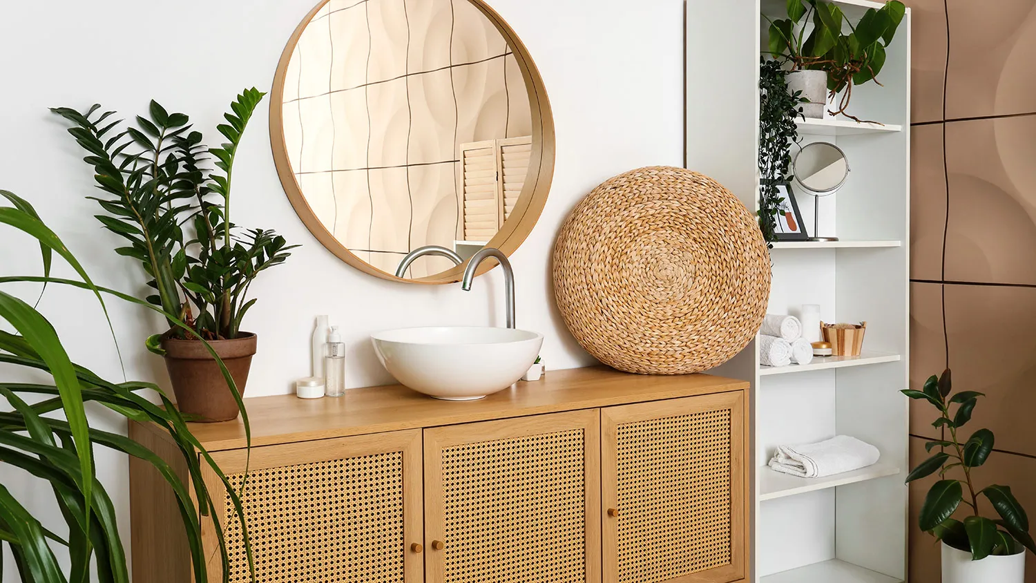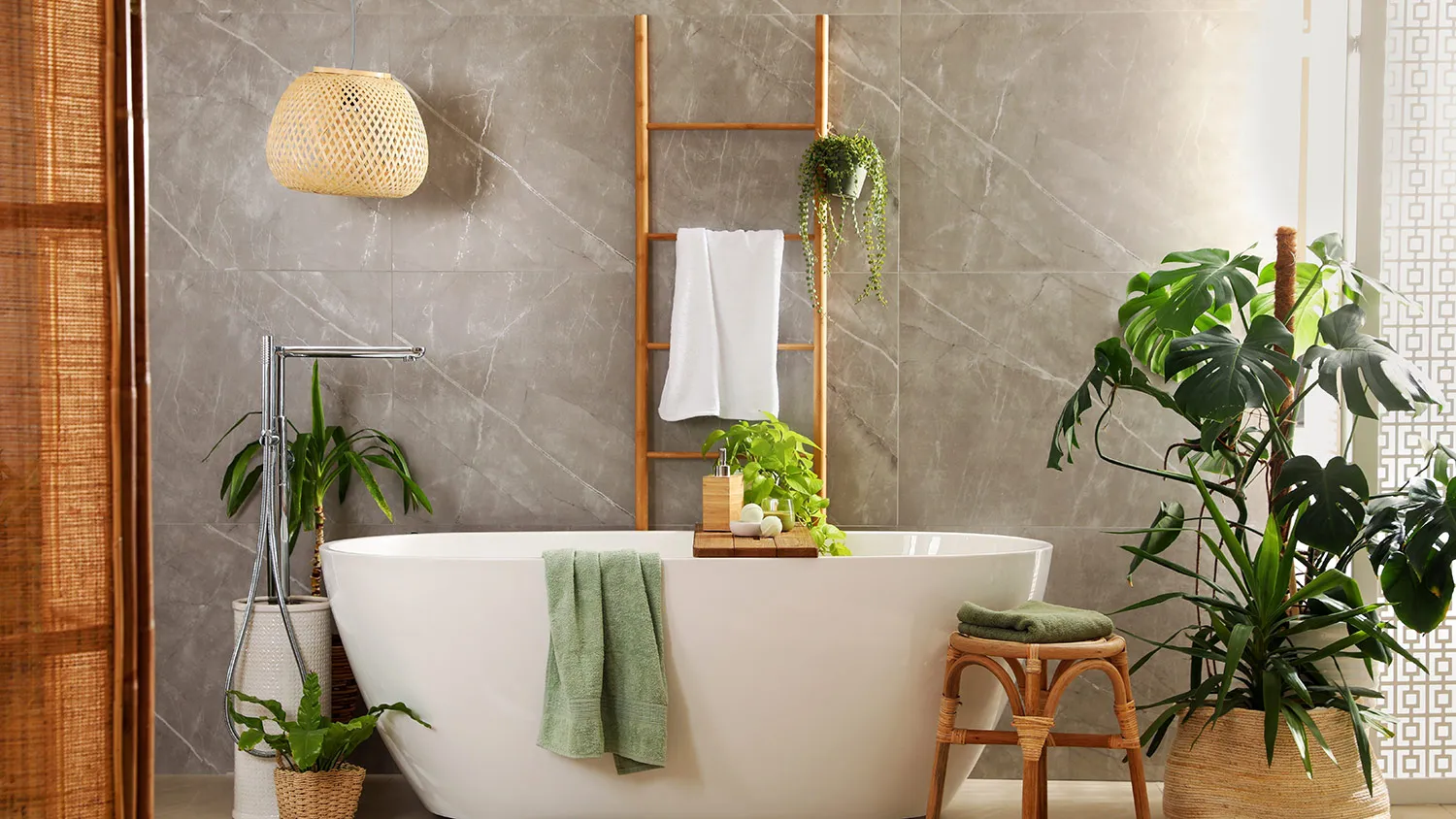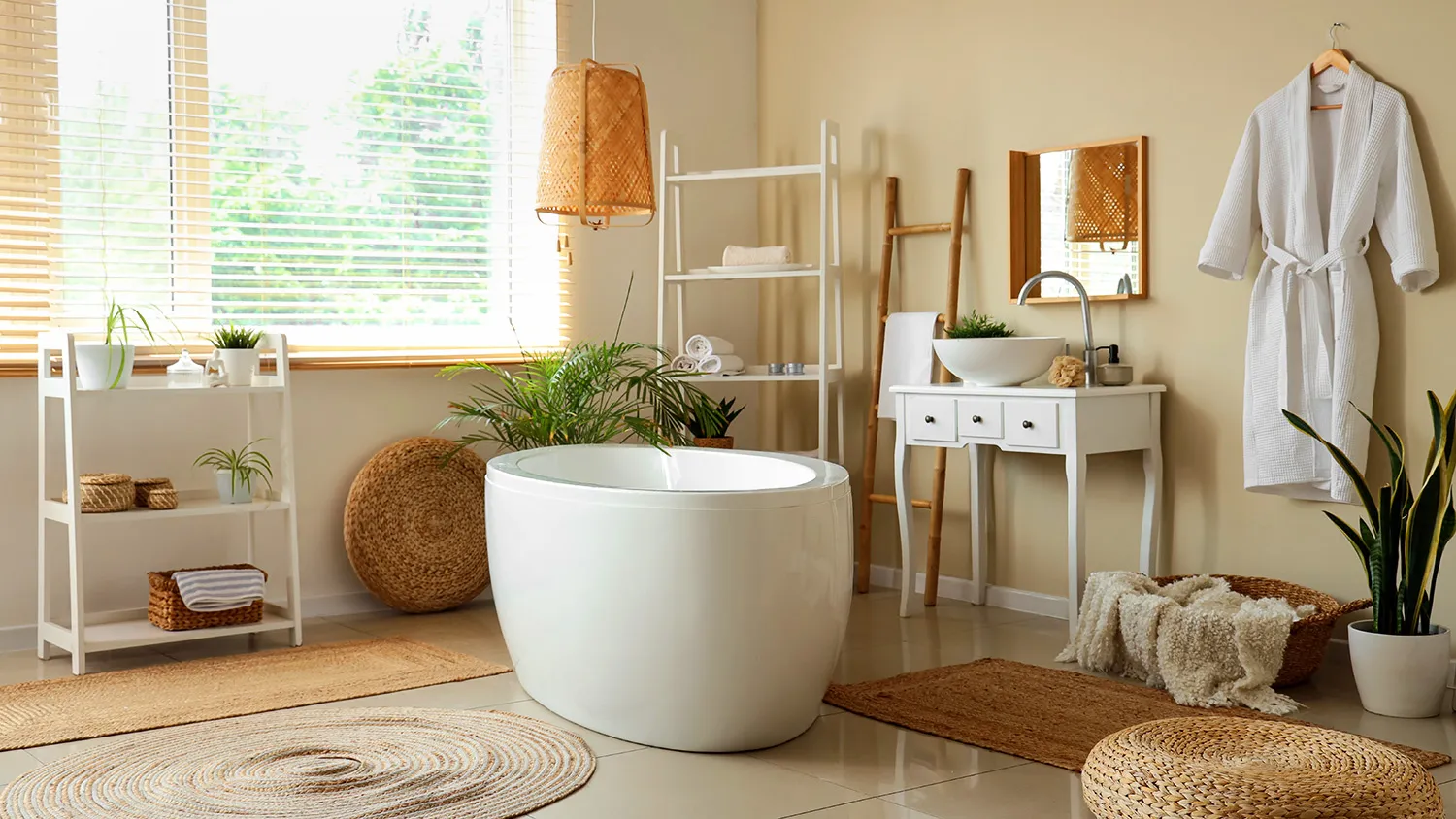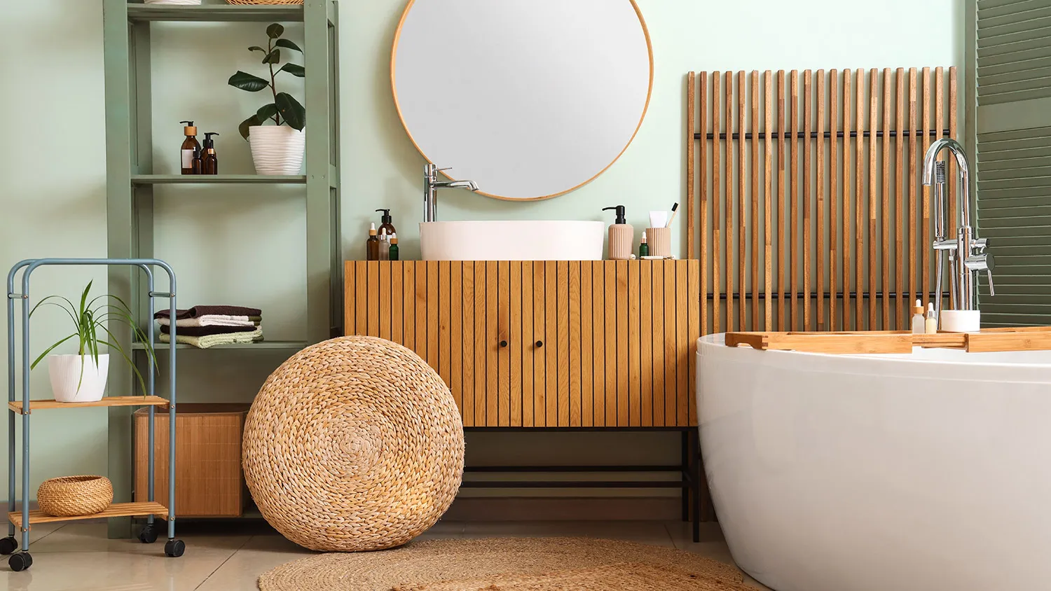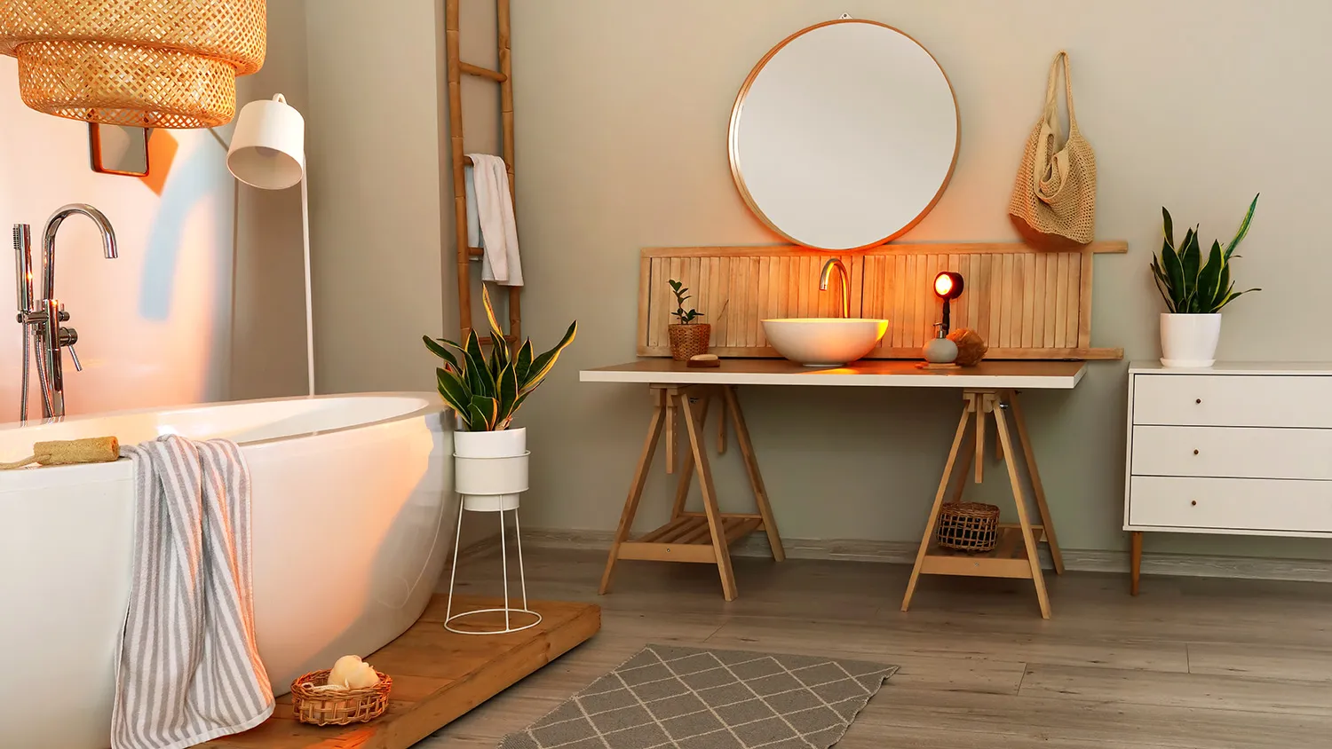 Акцент — на элементах декора. Поддоны и подголовники из дерева, бамбуковые лесенки-полотенцесушители, текстильные или плетеные корзины для белья, коврики из джута, свечи и, конечно же, растения.