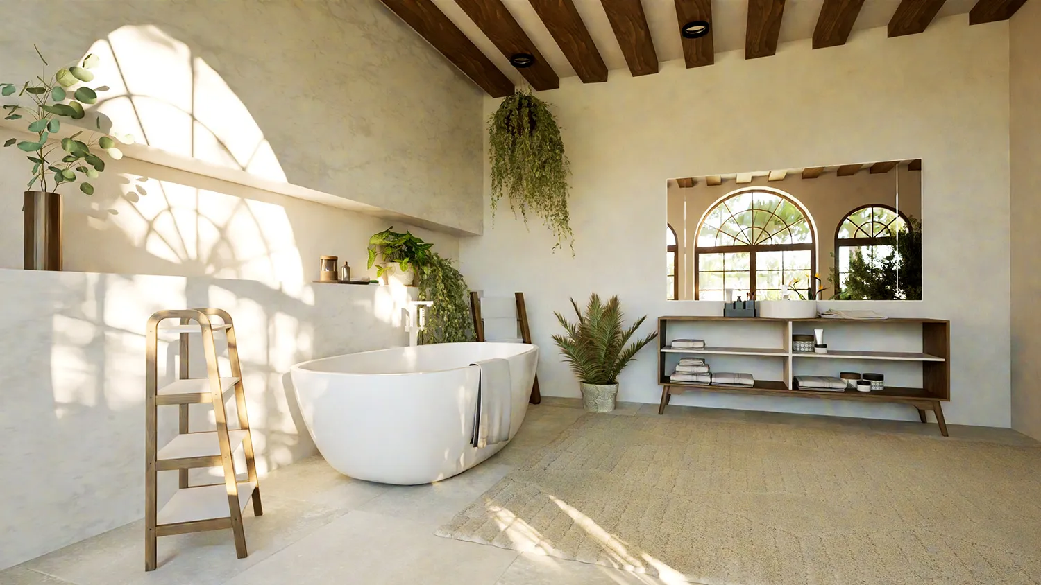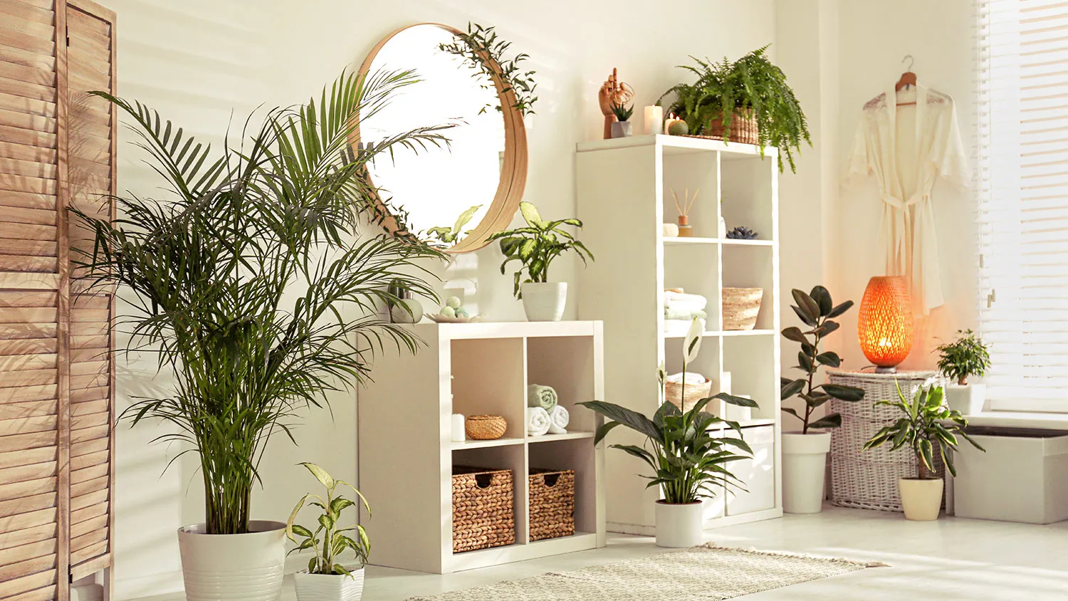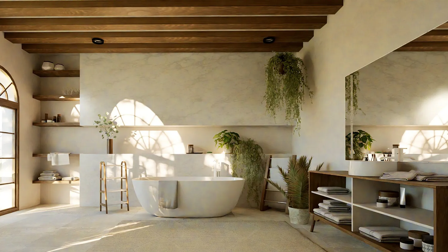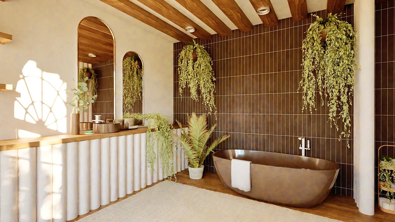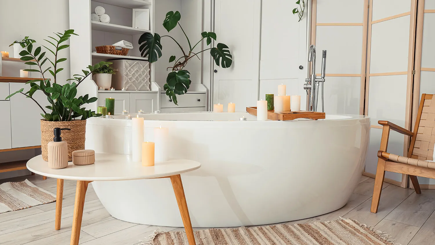 Акцент — на элементах декора. Поддоны и подголовники из дерева, бамбуковые лесенки-полотенцесушители, текстильные или плетеные корзины для белья, коврики из джута, свечи и, конечно же, растения.
